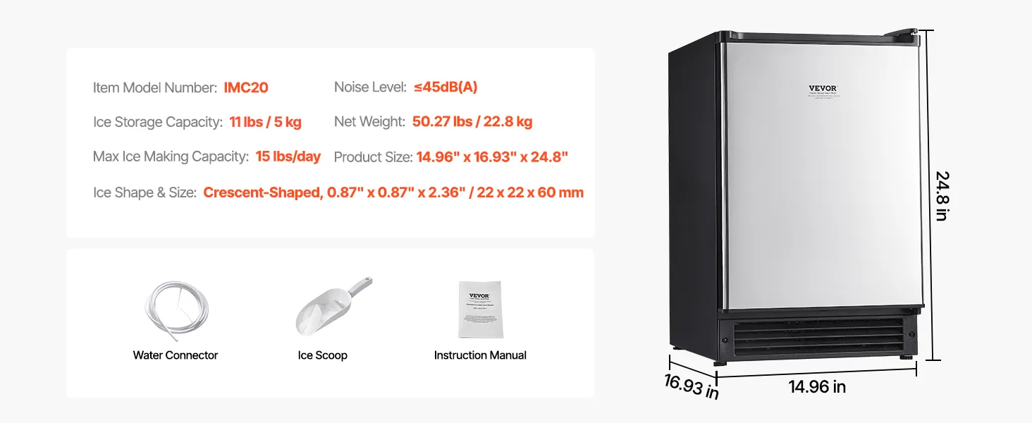 This powerful undercounter built-in ice maker can produce 15 lbs of crescent-shaped ice cubes (0.87x0.87x2.36 inch) per day, with ice ready in just 20 minutes. The ice basket has a capacity of 11 lbs, ensuring a steady supply to meet your ice needs.