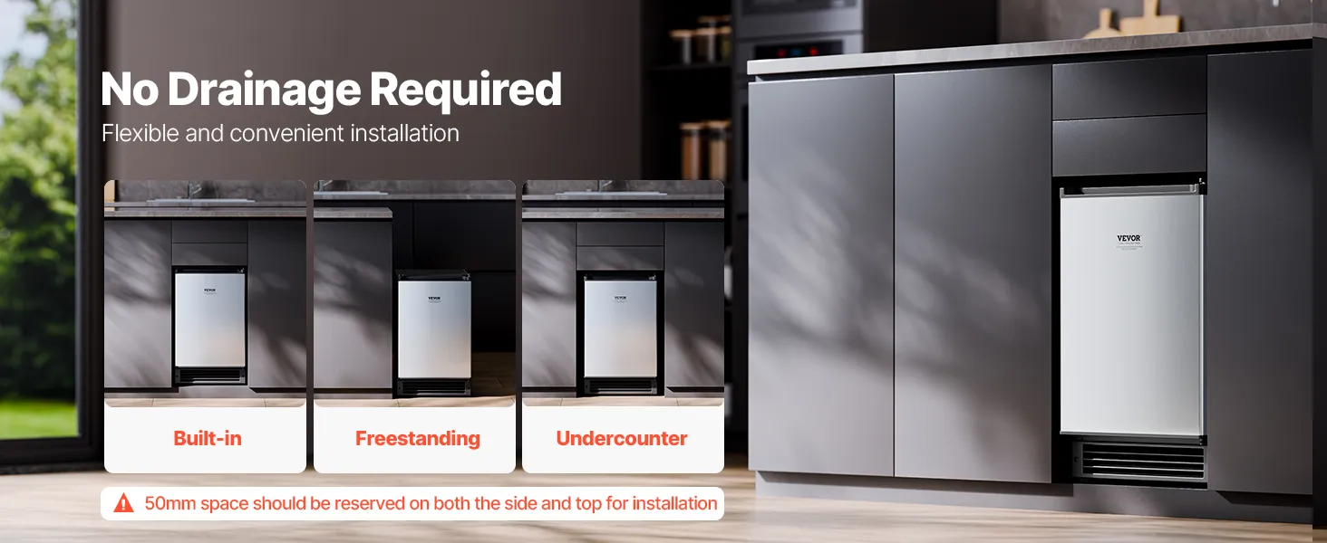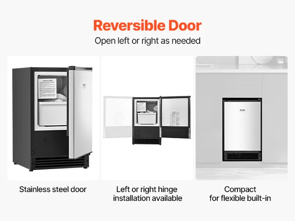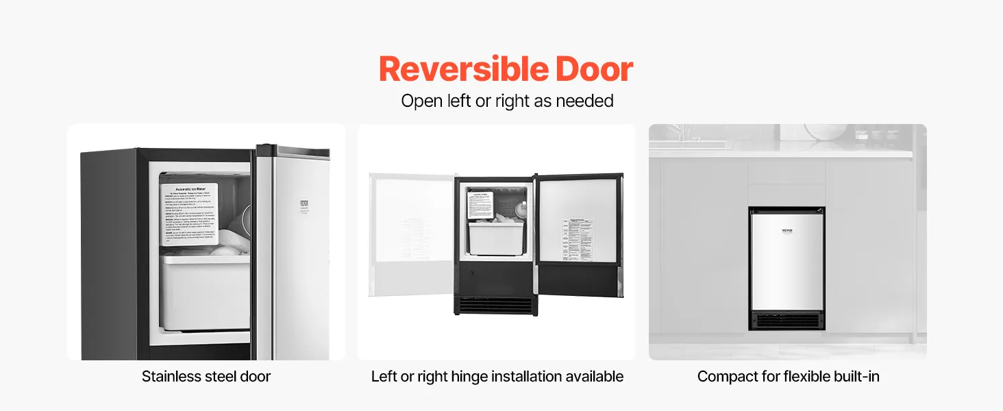 Flexible Installation: Equipped with a reversible stainless steel door and a full-length handle, this built in ice maker can be installed with either a left-hinged or right-hinged door for flexibility. It supports various installation types (undercounter, freestanding, or built-in), and requires 50mm of clearance on the sides and top for proper installation.