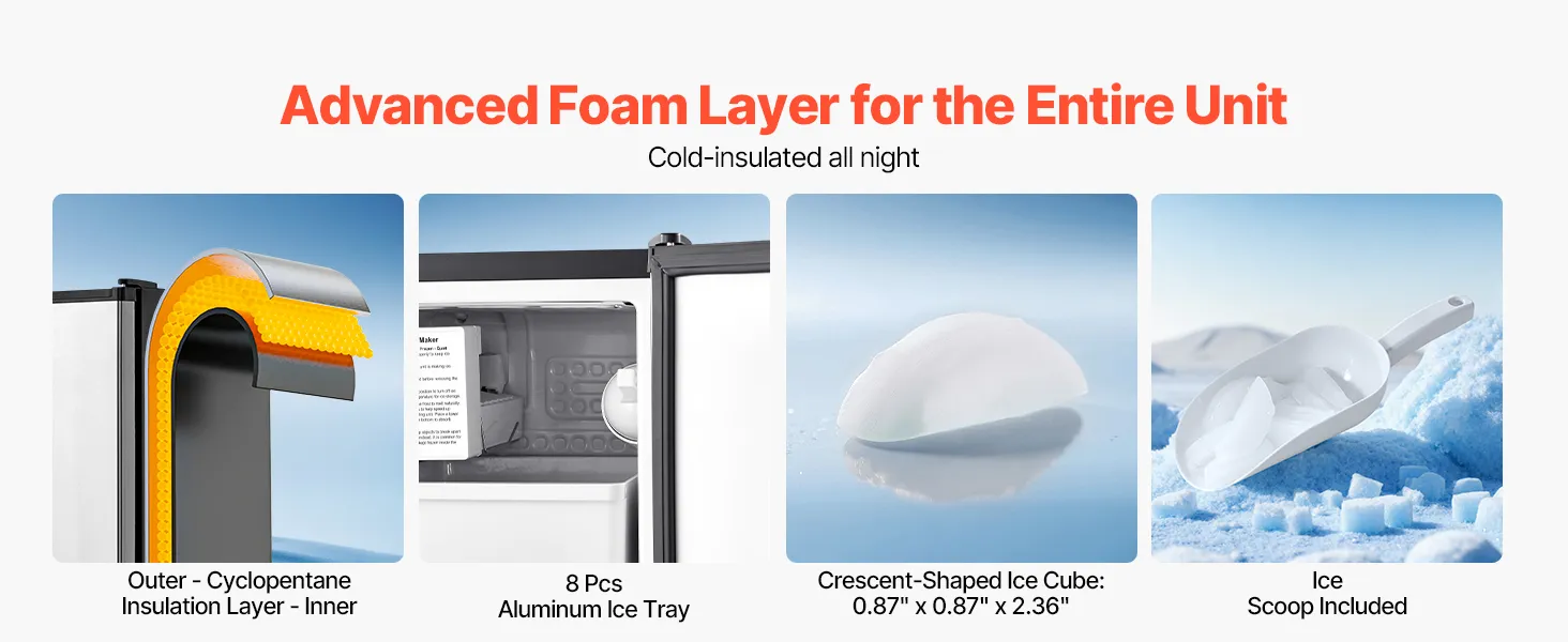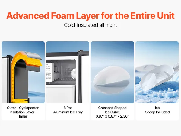 Cold Insulated: Constructed with triple-layer insulation, the body of the under counter ice maker is designed for excellent cold retention, keeping your ice crisp and clear. The ice cubes are perfect for slushies, cocktails, whiskey, and other beverages.