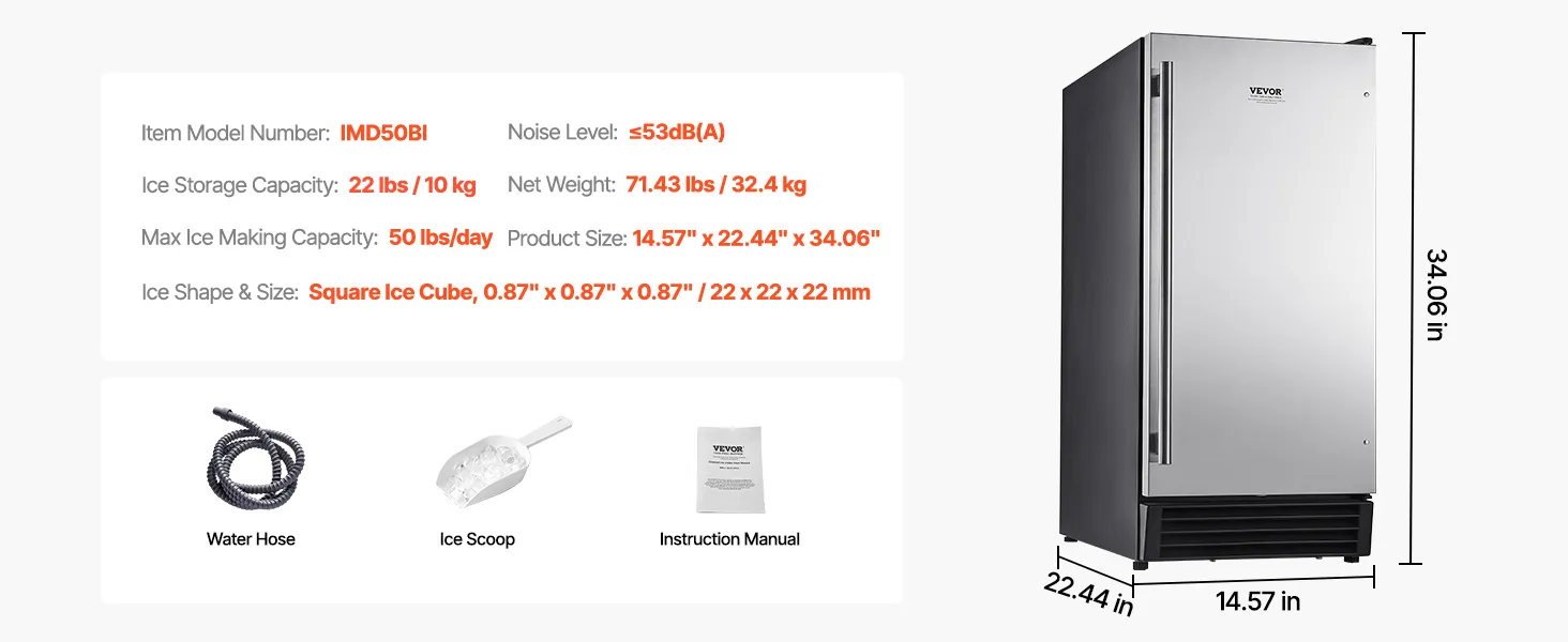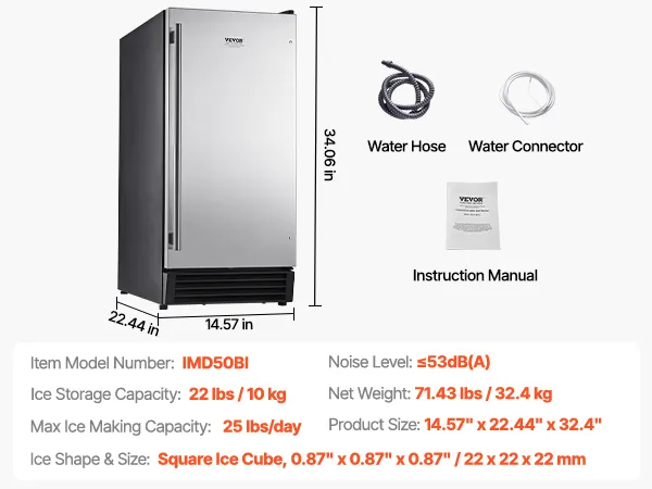 This powerful undercounter built-in ice maker can produce 50 lbs of square ice cubes (0.87x0.87x0.87 inch) per day, with ice ready in just 15 minutes. The ice basket has a capacity of 22 lbs, ensuring a steady supply to meet your ice needs.