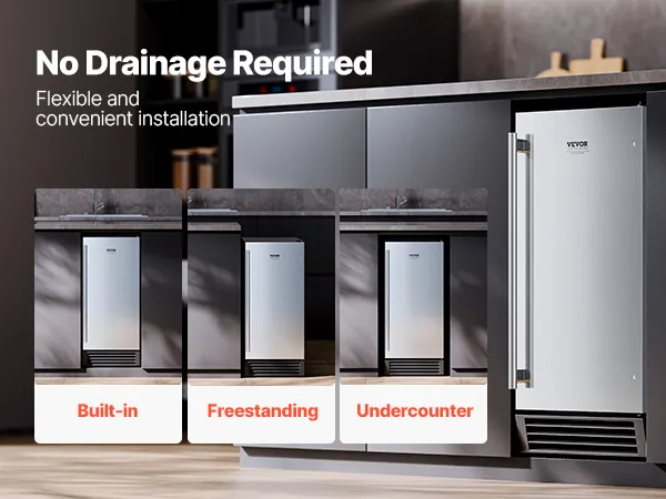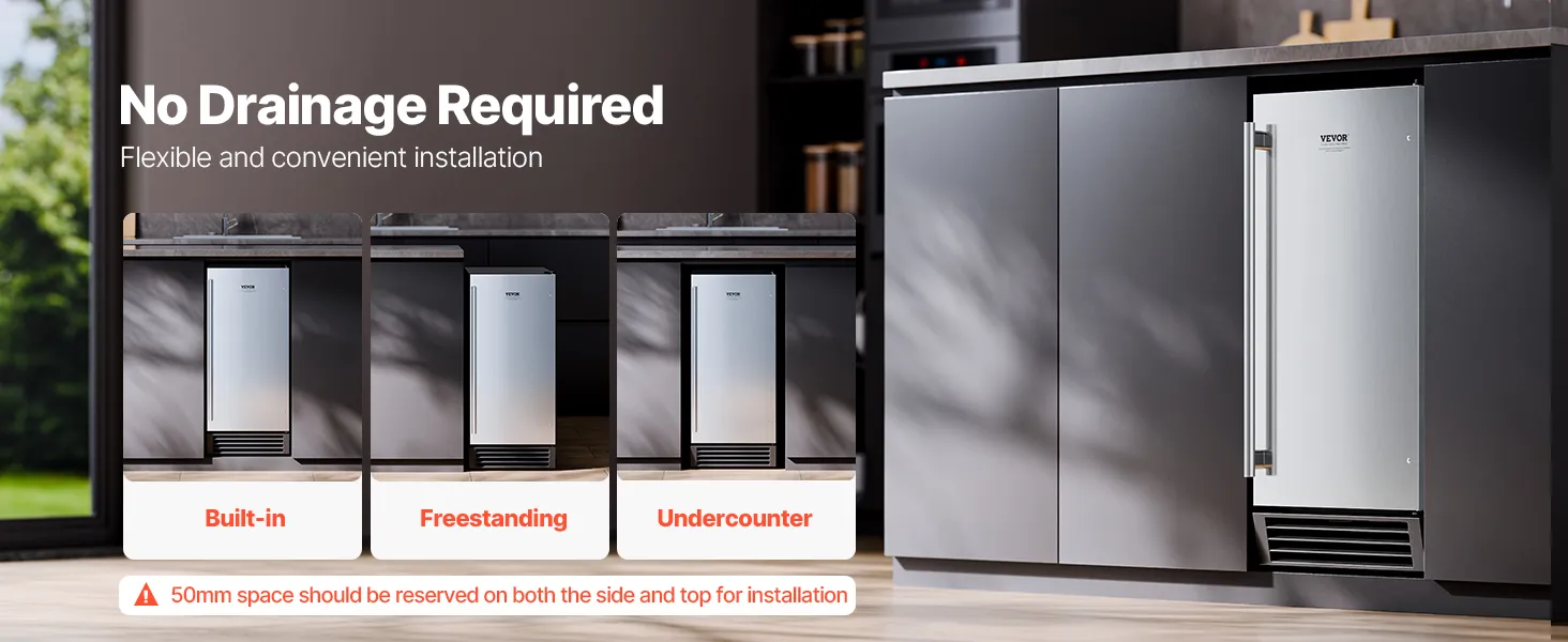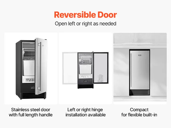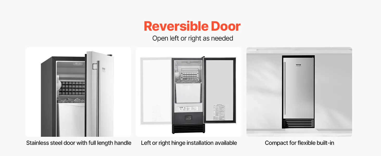 Flexible Installation: Equipped with a reversible stainless steel door and a full-length handle, this built in ice maker can be installed with either a left-hinged or right-hinged door for flexibility. It supports various installation types (undercounter, freestanding, or built-in), and requires 50mm of clearance on the sides and top for proper installation.