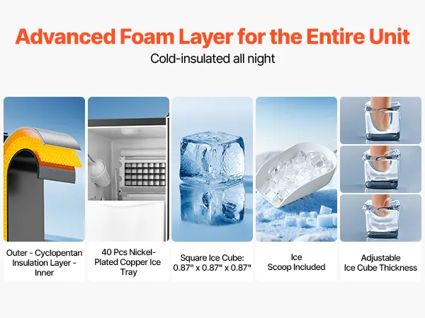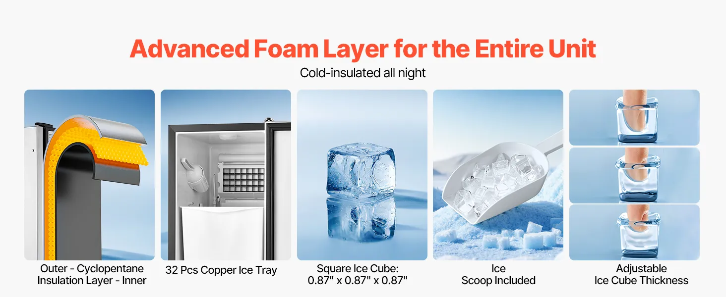 Cold Insulated: Constructed with triple-layer insulation, the body of the under counter ice maker is designed for excellent cold retention, keeping your ice crisp and clear. The ice cubes are perfect for slushies, cocktails, whiskey, and other beverages.