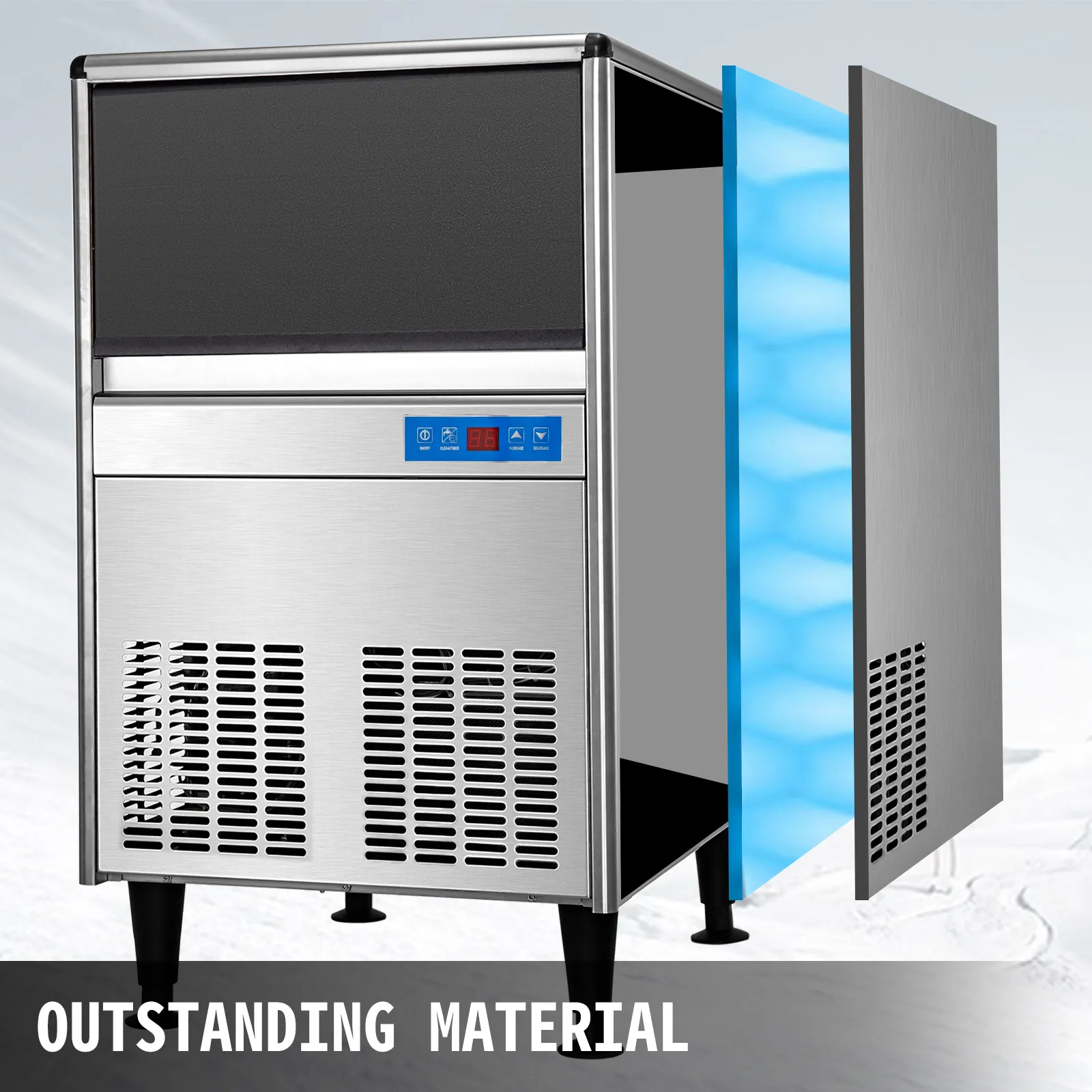 Con certificación ETL, esta máquina de hielo comercial adopta acero inoxidable 304 de alta calidad y material PP apto para uso alimentario, elegante, duradero y fácil de limpiar. La capa de espuma espesada de doble capa aísla eficazmente el calor externo y proporciona un mejor aislamiento, evitando que los cubitos de hielo se derritan durante 5 a 7 horas. Consejo: Para evitar que los cubitos de hielo se derritan durante mucho tiempo, guárdelos en el refrigerador o congelador.