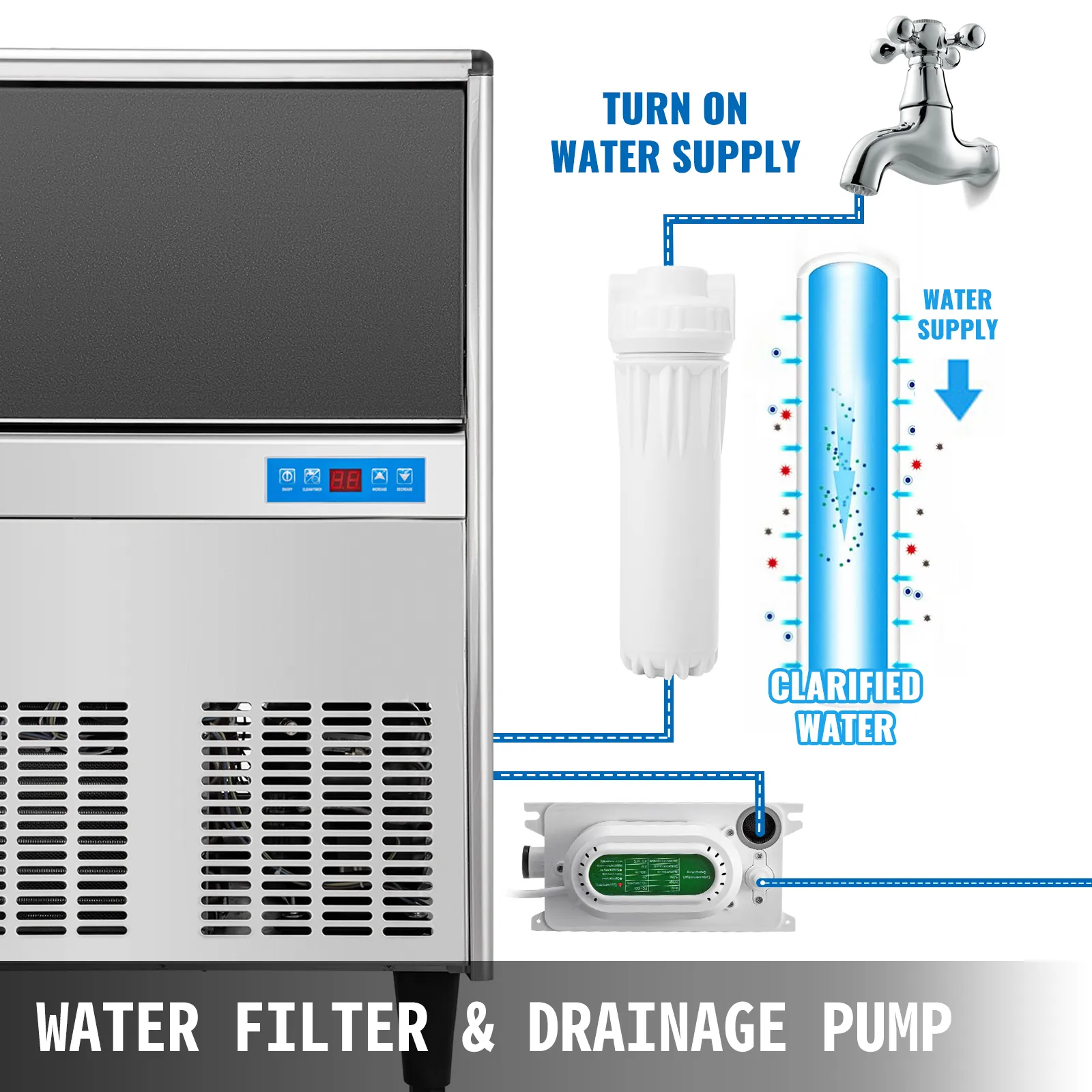Esta avanzada máquina comercial para hacer hielo es ideal para colocar debajo de la barra, muy adecuada para familias, bares, restaurantes, etc. Viene con un panel de control fácil de operar con botones aerodinámicos, que presenta varios sistemas de control patentados para un control conveniente. Se proporciona una gran capacidad de almacenamiento de hielo de 66 libras (30 kg) para la conservación a largo plazo de los cubitos de hielo. Dos filtros de agua y una bomba de drenaje están disponibles para producir cubos de hielo limpios, higiénicos y saludables, ahorrándole tiempo y esfuerzo.