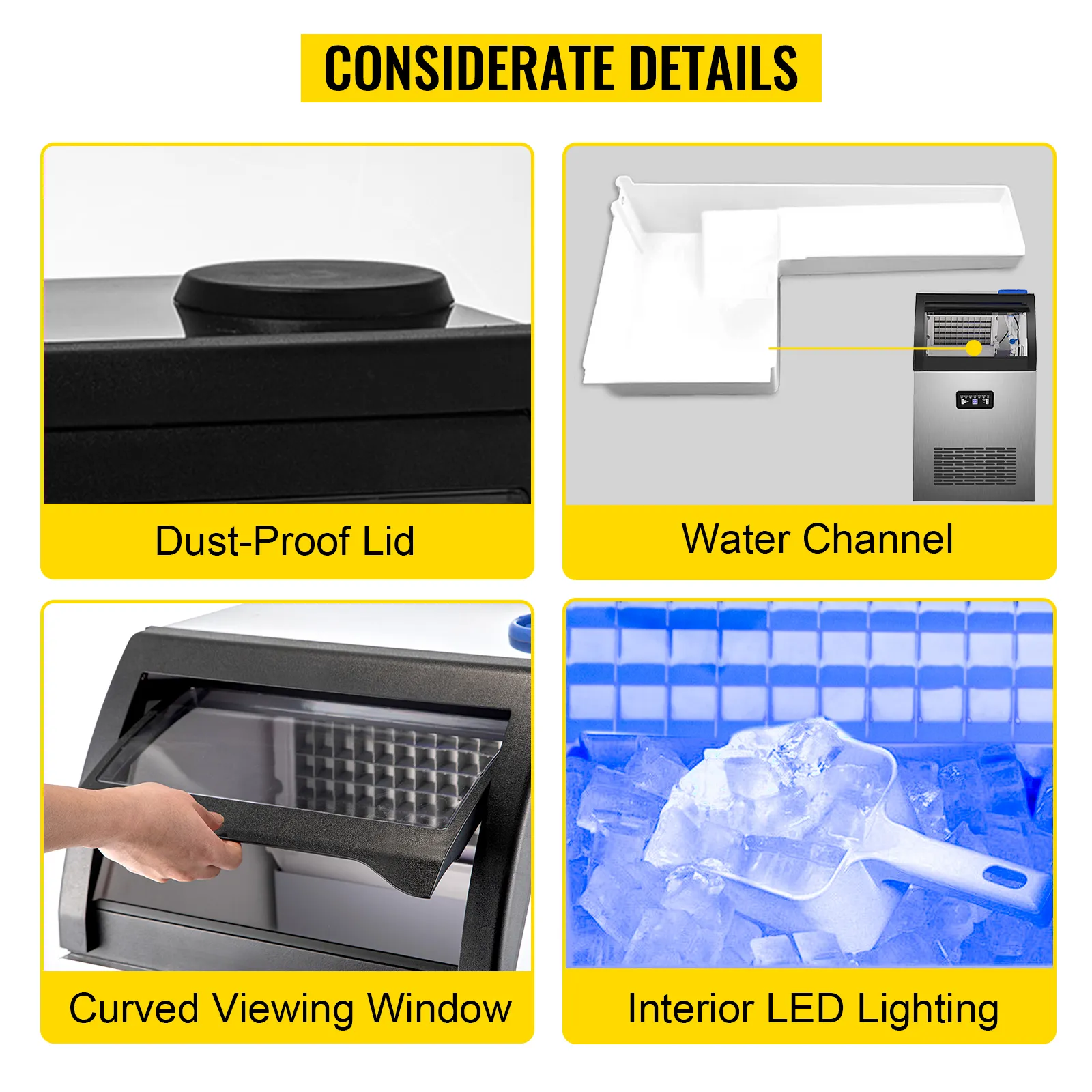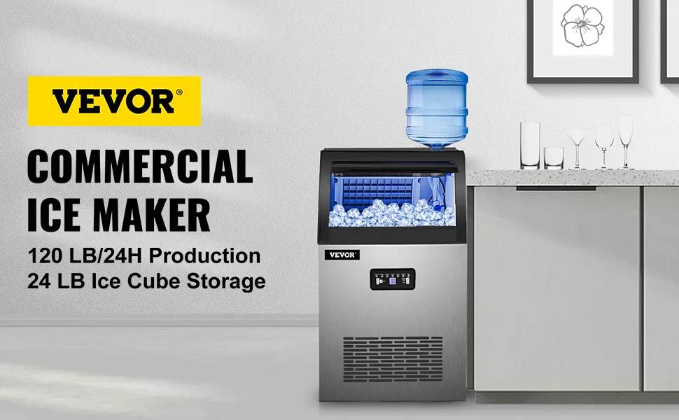 Con la bandeja de hielo incorporada de 50 PC (5x10), esta máquina de hielo comercial puede producir 120 libras de cubitos de hielo cada 24 horas. El almacenamiento de hielo de esta máquina compacta también alcanza las 24 lbs. Alimentado por el compresor de 450 W, cada ciclo de fabricación de hielo dura entre 8 y 15 minutos.