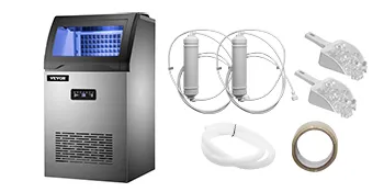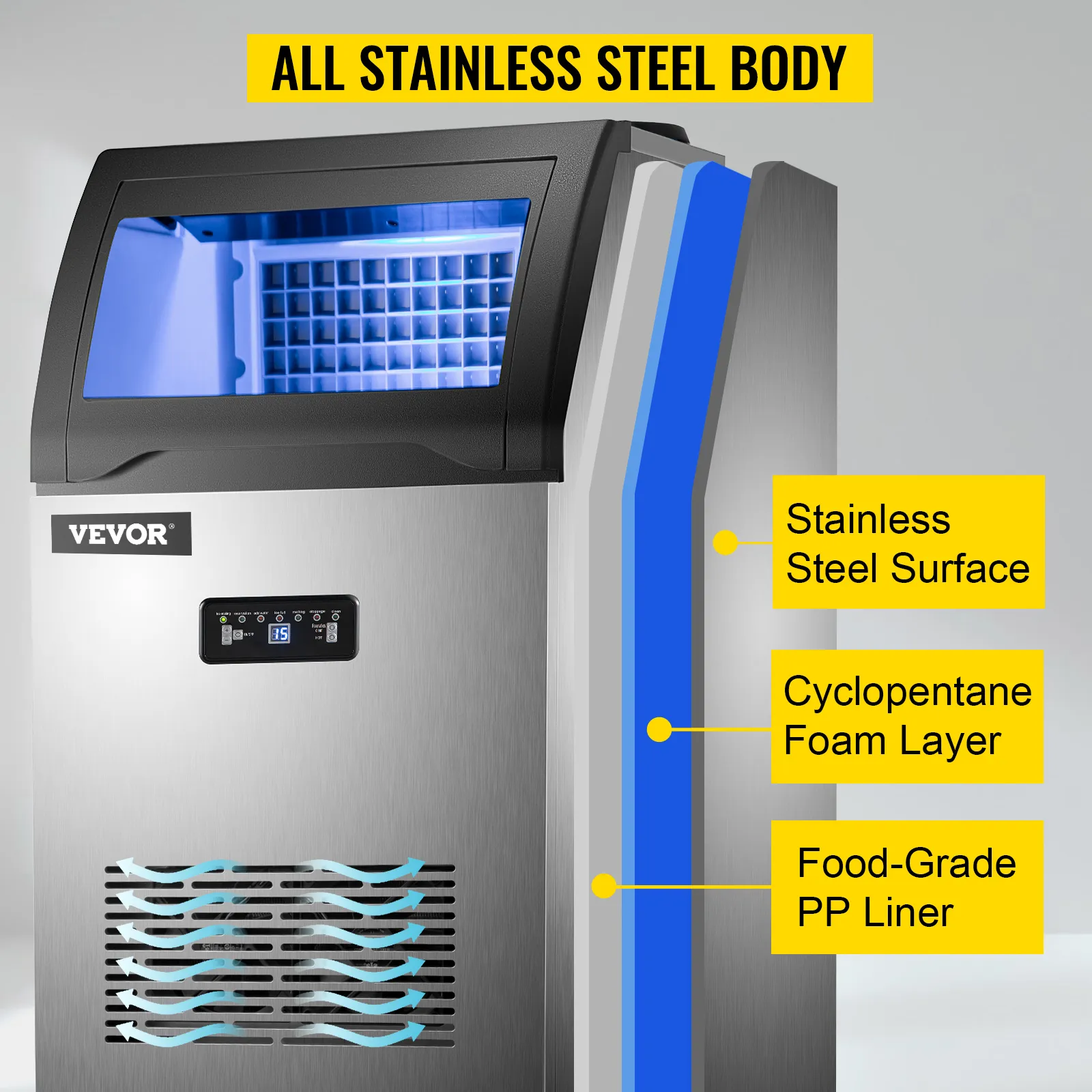 - Compuesta por una carcasa de acero inoxidable de alta resistencia, una capa de espuma de ciclopentano espesada y un revestimiento interior de PP apto para uso alimentario, nuestra máquina de hielo comercial es fácil de limpiar y está construida para durar. Puede producir alrededor de 55 kg (120 lb) de cubitos de hielo cada 24 horas y la capacidad de almacenamiento alcanza los 11 kg (24 lb) a pesar de su tamaño compacto. Con los dos modos de entrada de agua, puede funcionar con agua del grifo y un suministro de agua embotellada. Además, también se proporcionan 2 filtros de agua y tubería de drenaje. Esta máquina de hielo comercial es perfecta para su negocio de hostelería o de alimentos y bebidas.