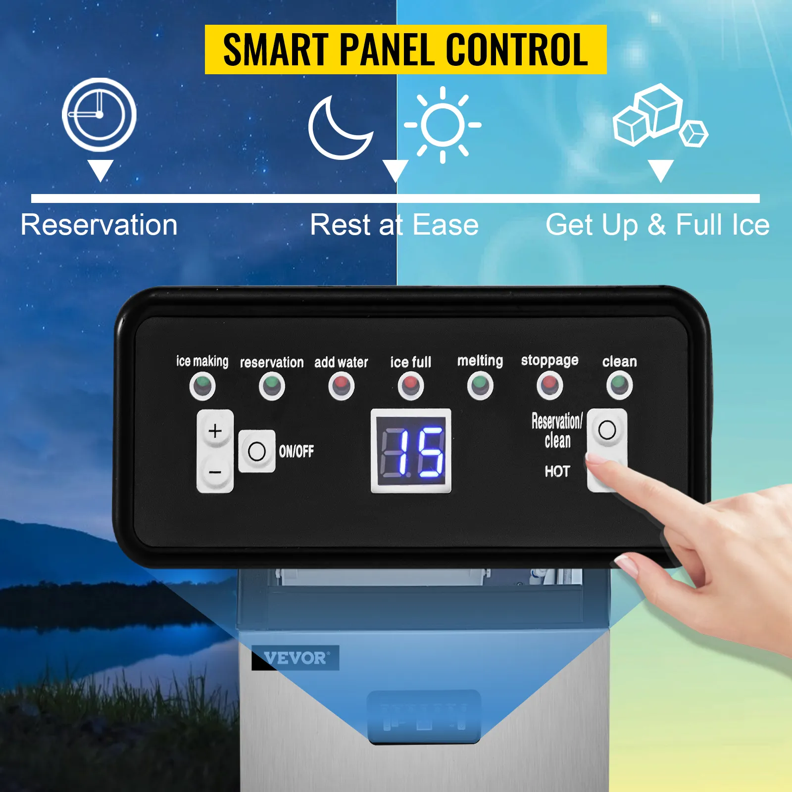 El panel de control rico en características con una pantalla LCD contiene varias funciones. Puedes hacer los cubitos de hielo más gruesos o más delgados como desees. Presiona los botones; luego, logrará reservas para hacer hielo, limpieza con un solo clic y control de luz azul. También se integran otras funciones, como parada total de hielo, recordatorio automático de caída de hielo, etc.