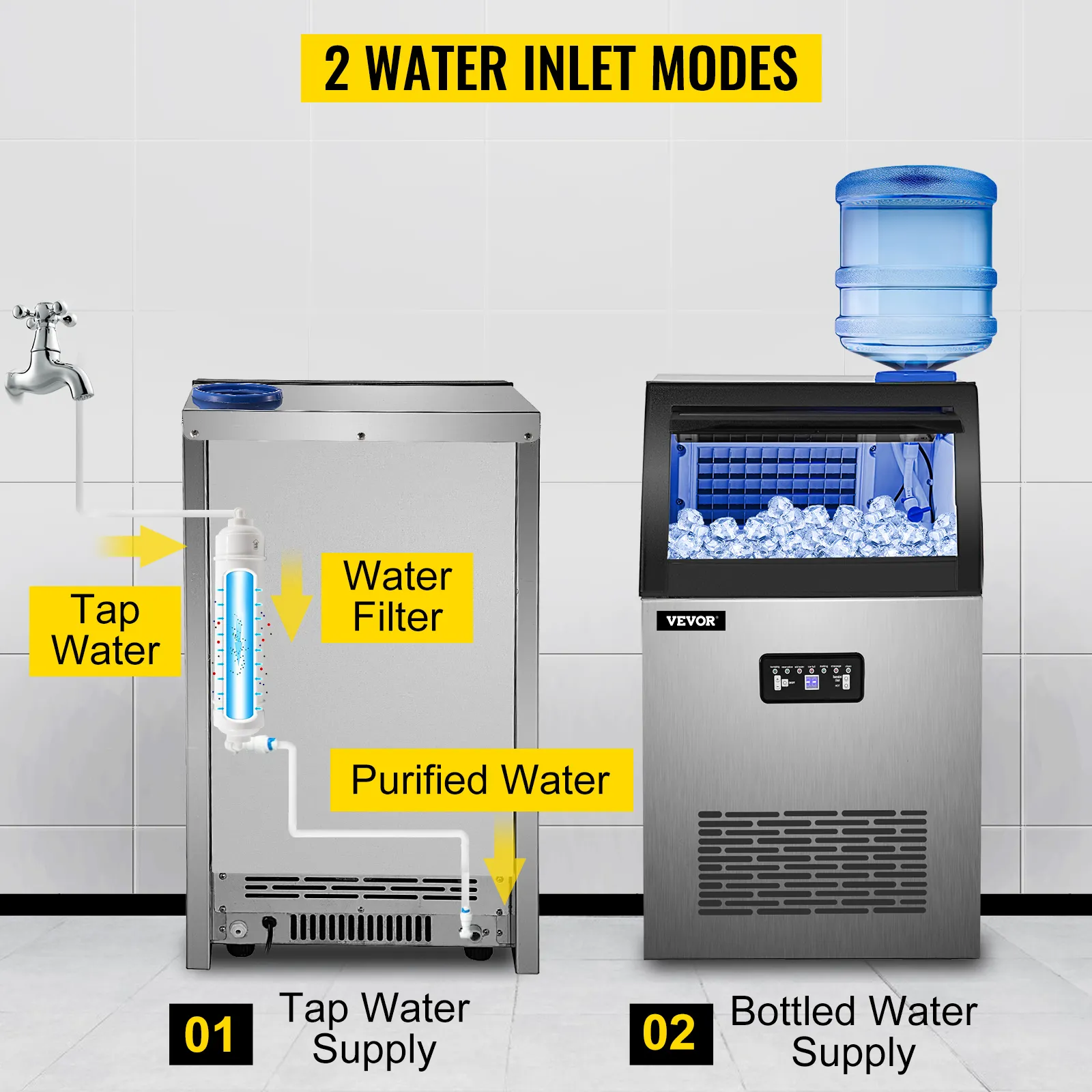Nuestra máquina de hielo comercial es compatible con el suministro de agua del grifo y agua embotellada, satisfaciendo sus demandas de hielo en el flujo máximo y reduciendo las restricciones en los lugares de uso. Puede ponerlo en uso donde haya un cable de alimentación. También se proporciona un filtro de agua para purificar el agua del grifo y una tubería de drenaje para descargar el hielo derretido.