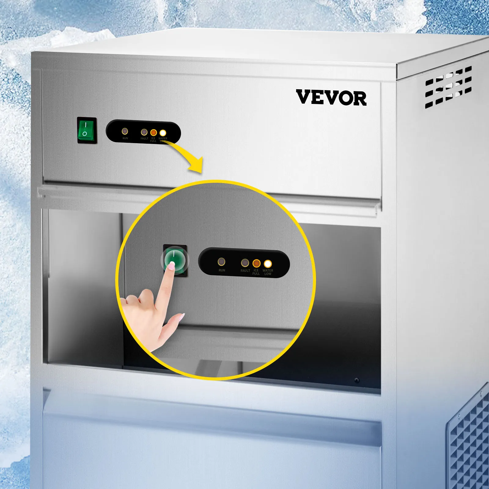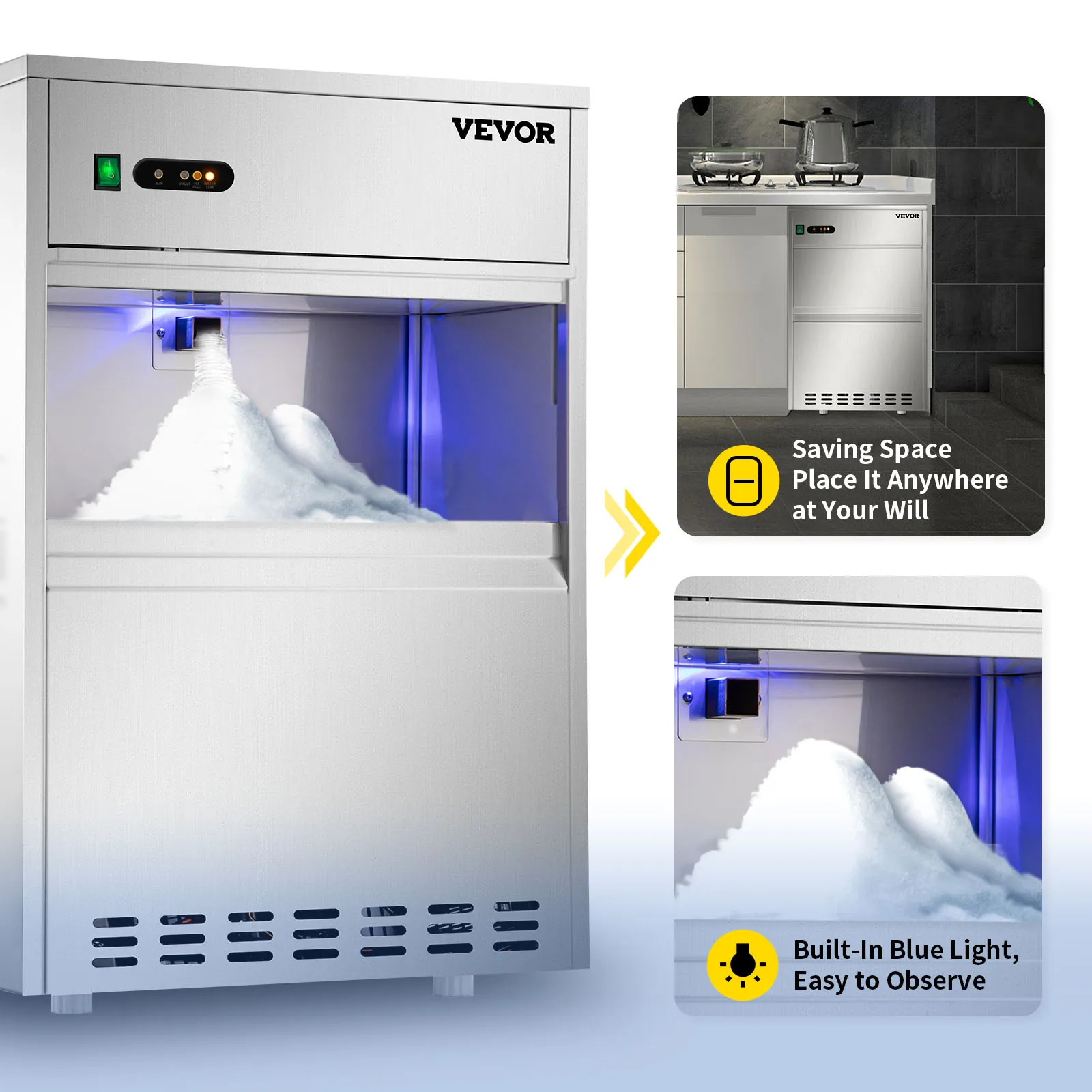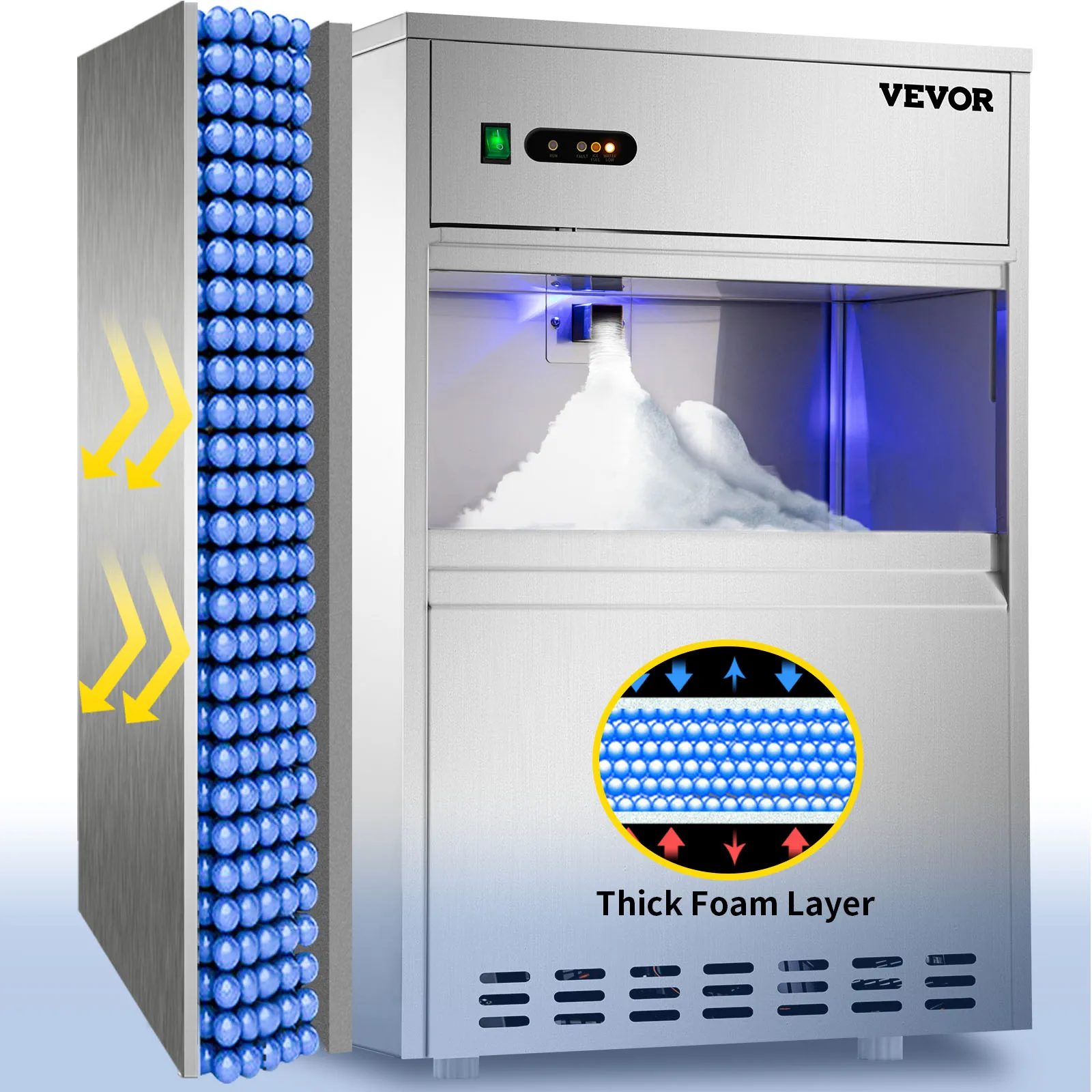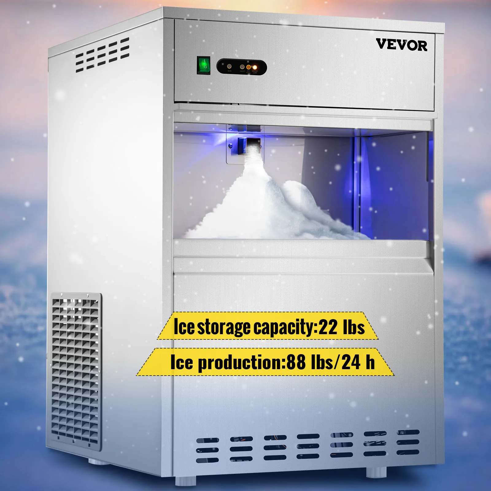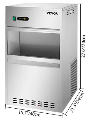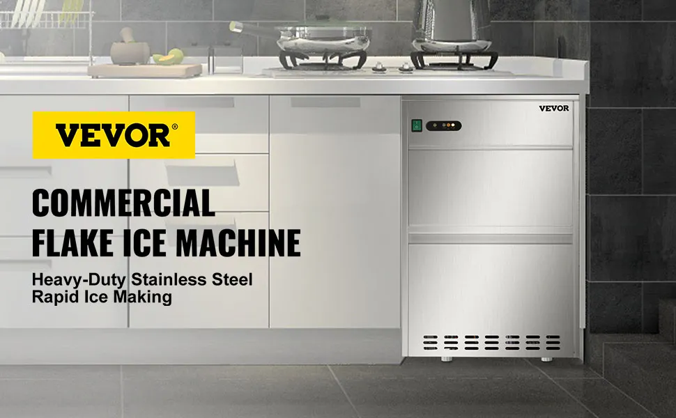 La máquina de hielo en escamas puede producir 88 libras de copos de nieve cada 24 horas, y el gabinete de almacenamiento puede contener alrededor de 22 libras de hielo, con una capa de espuma espesa para la conservación a largo plazo del hielo de nieve.