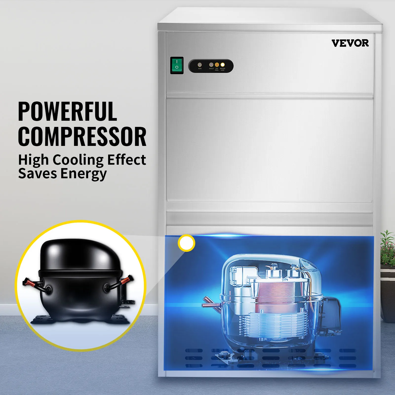 Como el corazón del sistema de refrigeración, el potente compresor de 380 vatios está equipado con la función de enfriamiento fuerte, bajo nivel de ruido y ahorro de energía, con una larga vida útil.