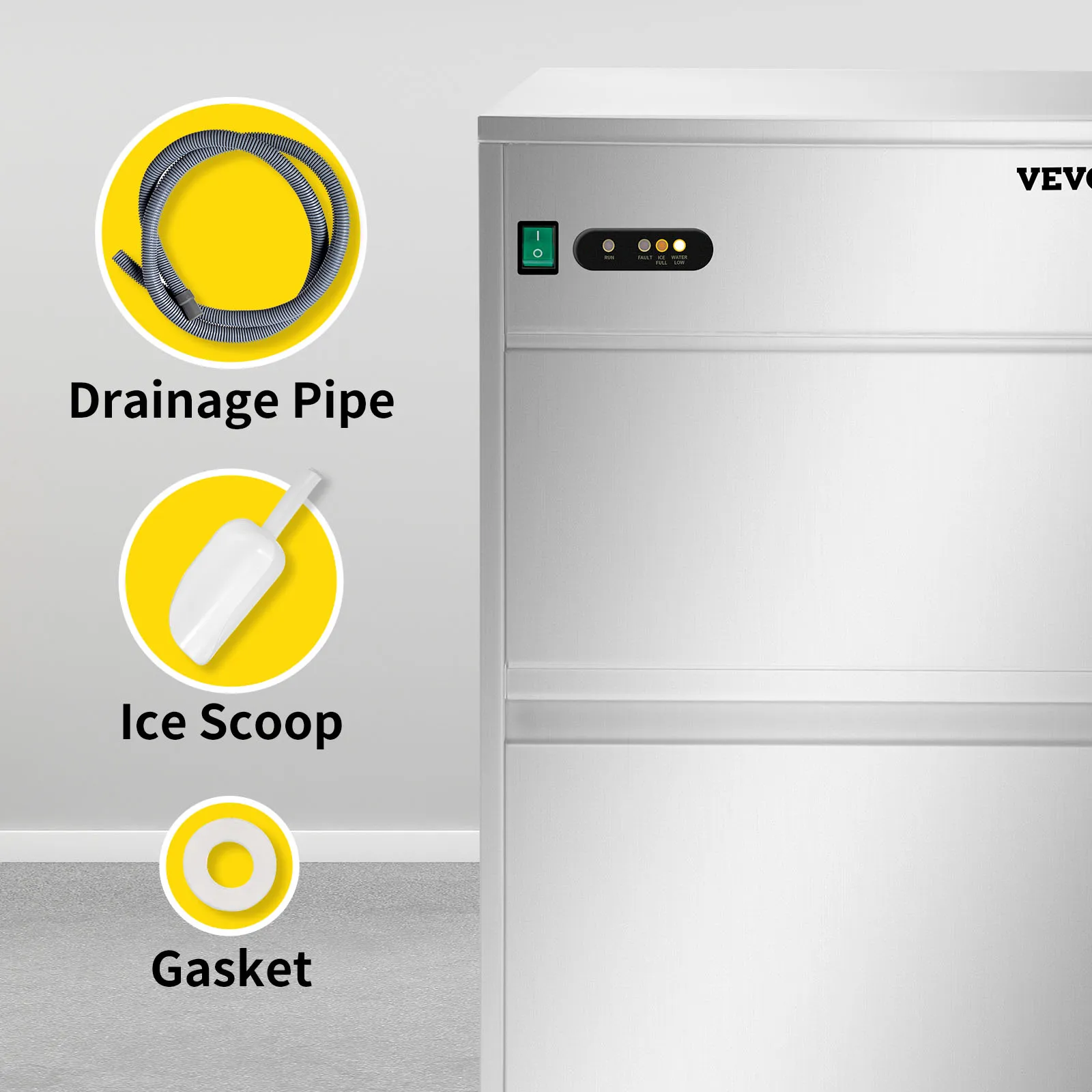 Construida con acero inoxidable 304 duradero y material ABS apto para uso alimentario, nuestra máquina de hielo en escamas es fácil de limpiar y construida para durar. El alto rendimiento de hielo de 88 lb y la gran capacidad de almacenamiento de 22 lb hacen que esta máquina sea perfecta para su hospitalidad. Y los accesorios prácticos, como el tubo de drenaje y la pala para hielo, se proporcionan cuidadosamente.
