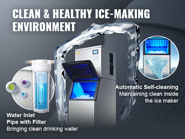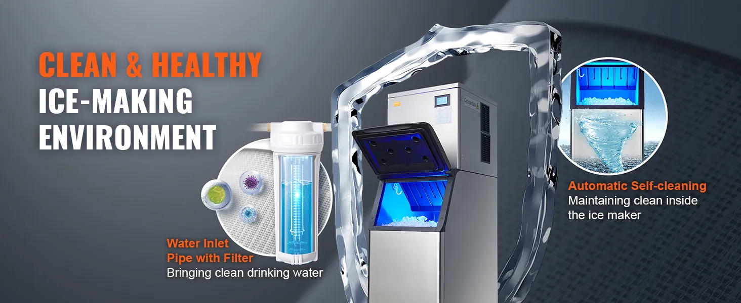 Limpiar un electrodoméstico puede llevar mucho tiempo y requiere esfuerzo. Si no desea pasar todo el día limpiando otro electrodoméstico en el bar cafetería restaurante de su negocio, le alegrará que esta máquina de hacer hielo ofrezca una función de autolimpieza sin esfuerzo. La máquina de hielo comercial VEVOR está diseñada para limpiarse sola, lo que garantiza que el hielo producido sea limpio, saludable y perfecto para preparar bebidas frías y refrescantes.