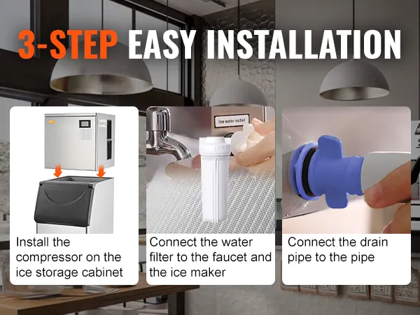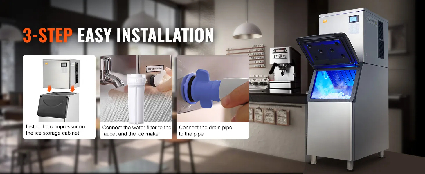 Para simplificar y automatizar el proceso de limpieza, VEVOR equipó esta máquina con una bomba de drenaje eléctrica con certificación UL y tres salidas. Junto con su altura de elevación de 2 m, puede drenar la máquina sin esfuerzo desde el contenedor de almacenamiento grande de 330,7 libras y la unidad principal. Con un diseño tan brillante, es más fácil mantener esta máquina de hacer hielo en óptimas condiciones que otros modelos.