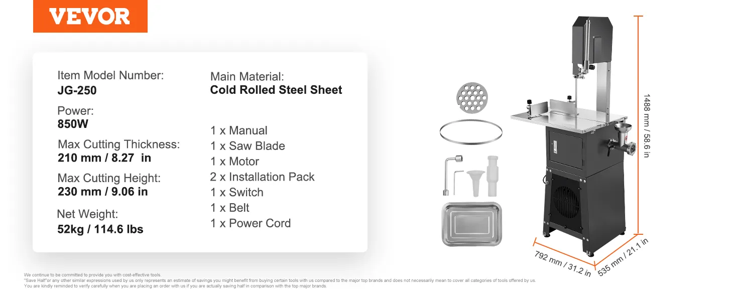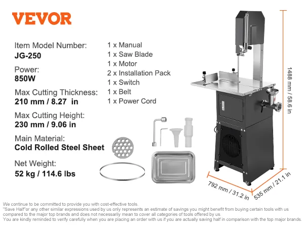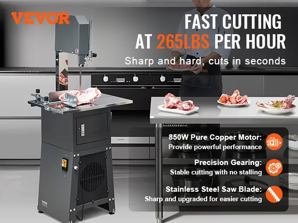 Estable y eficiente: el motor de cobre puro de 850 W proporciona una potencia impresionante, y la afilada hoja de sierra de acero inoxidable, junto con engranajes de precisión, garantiza un corte suave sin atascos, lo que le permite cortar fácilmente varios huesos duros y carne congelada con un suave empujón.