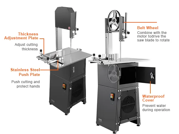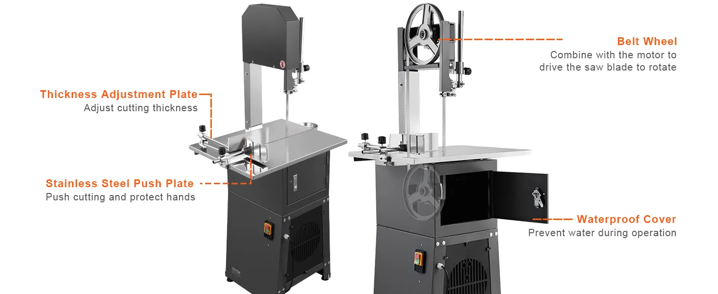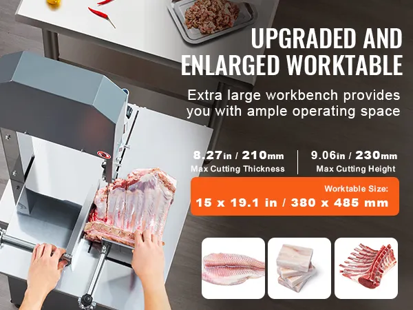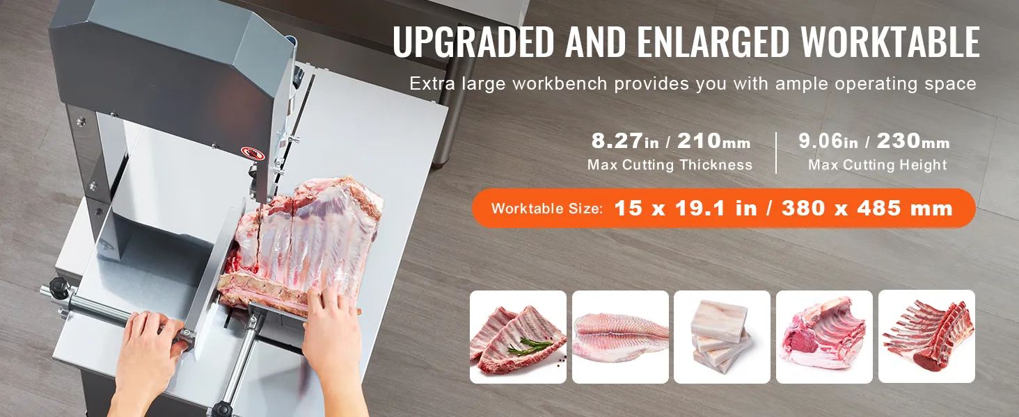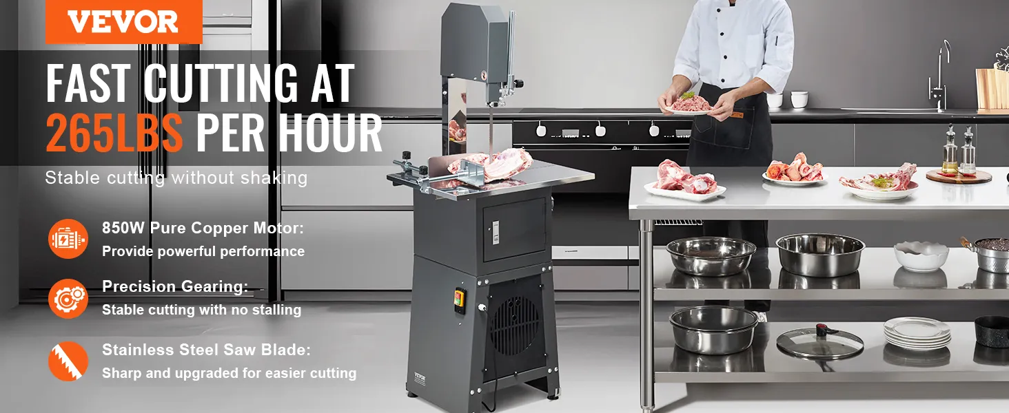 Sierra de cinta eléctrica comercial para carne VEVOR, sierra vertical para huesos de acero inoxidable de 850 W, banco de trabajo de 48 x 38 cm, grosor de corte de 18 cm, cortadora de carne congelada con cuchilla para costillas de cerdo y res.
