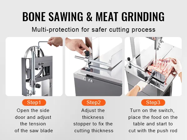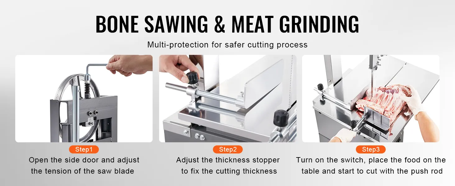La máquina tiene dos funciones principales: aserrar huesos y moler carne, lo que hace que sea más conveniente moler directamente la carne después de cortarla. Es muy adecuada para cortar costillas de cerdo, carne congelada, etc., y se usa ampliamente en hoteles, restaurantes, supermercados, cocinas domésticas y otros lugares.