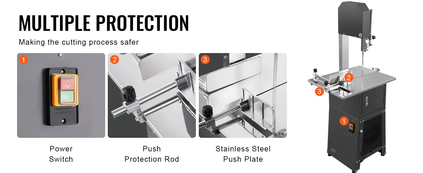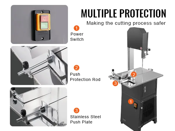 ¡Priorizamos su seguridad! Nuestra máquina para cortar carne cuenta con una placa y una varilla de empuje de acero inoxidable, que mantienen sus manos alejadas de la hoja de sierra afilada durante el funcionamiento. Siéntase seguro y confiado durante todo el proceso de corte.