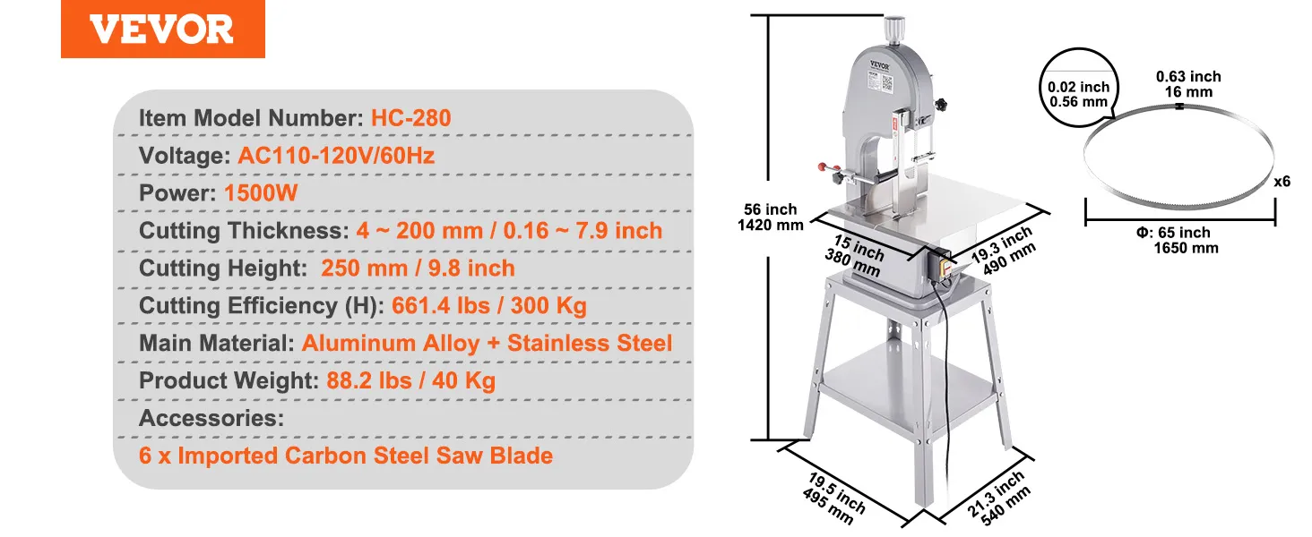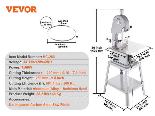 Sierra de cinta eléctrica comercial para carne VEVOR, 1500 W, sierra vertical para huesos de acero inoxidable, Workbeach de 49,5 x 38 cm, grosor de corte de 4,1 a 20 cm, cortadora de carne congelada con 6 cuchillas para costillas de cerdo y res.