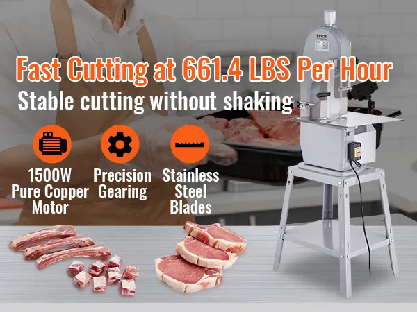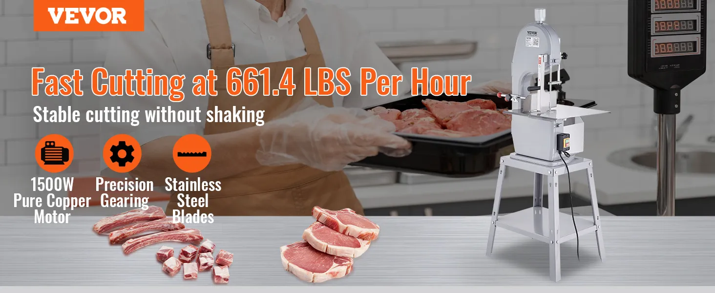 Nuestra sierra para huesos funciona con un motor de cobre puro de 1500 W para brindar una fuerza inigualable. Combinado con cuchillas afiladas de acero inoxidable y engranajes de precisión, garantiza un corte perfecto con una eficiencia de hasta 661,4 lb/h. Con un suave empujón, puedes cortar los huesos duros y la carne congelada.