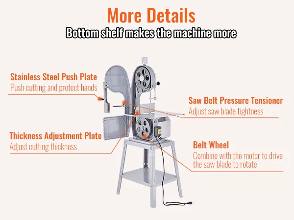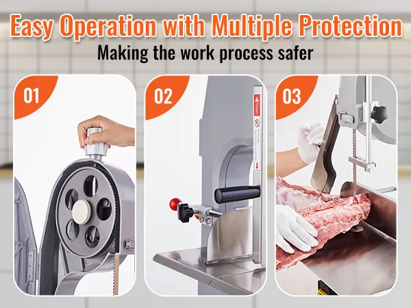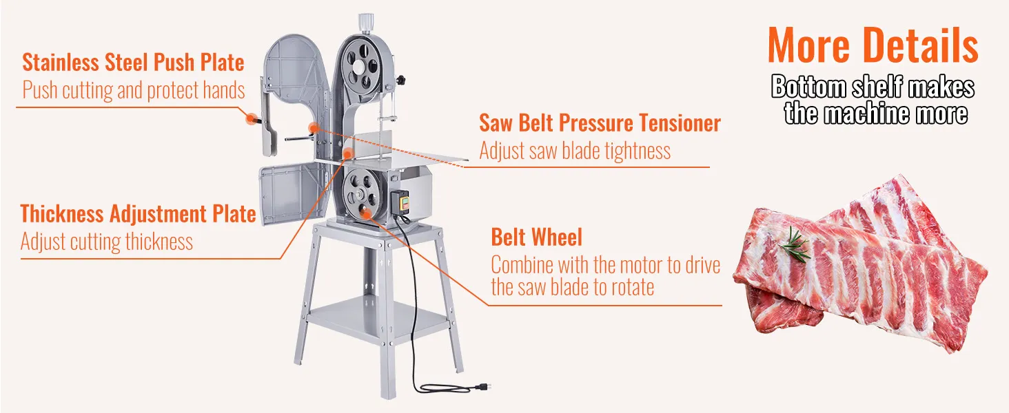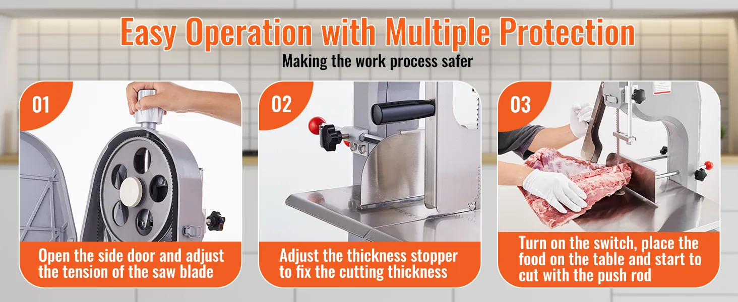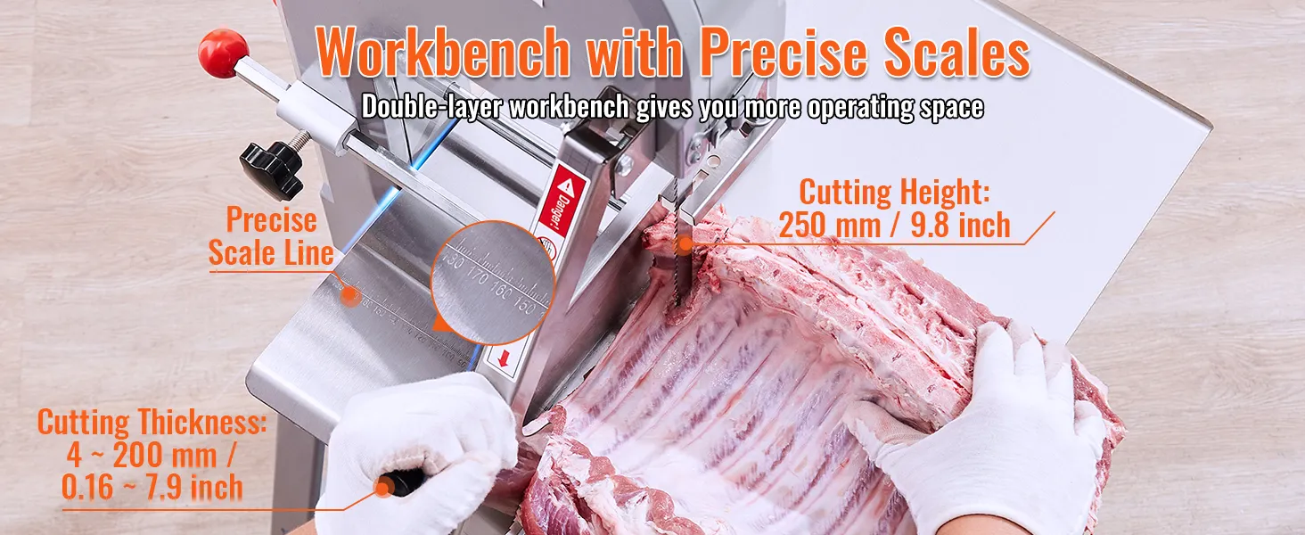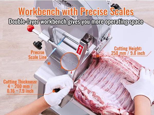 Nuestra mesa de trabajo de acero inoxidable presenta líneas de escala precisas, puede ajustar el grosor deseado (0.16 a 7.9 pulgadas). No importa si se trata de huesos grandes de pierna de cordero o huesos de pierna de res, nuestra máquina puede manejarlos todos. Desde delicadas lonchas de jamón hasta trozos de hueso, aborda todos los cortes a la perfección.