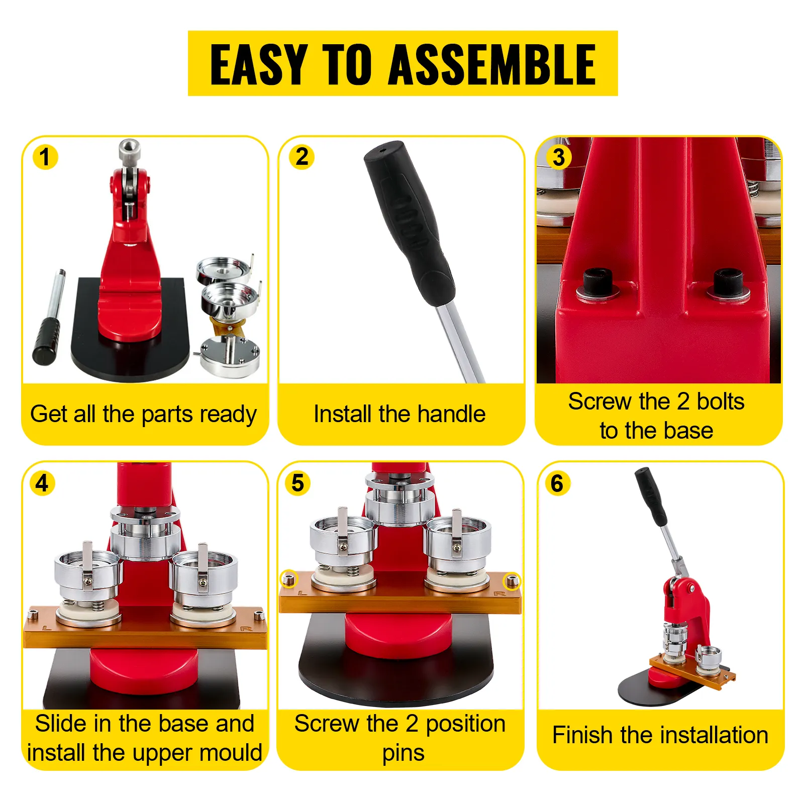El fabricante de pines es fácil de montar con las instrucciones; solo faltan seis pasos. Es perfecto para botones personalizados de bricolaje y regalos personalizados para escuelas, comunidades, empresas y familias.