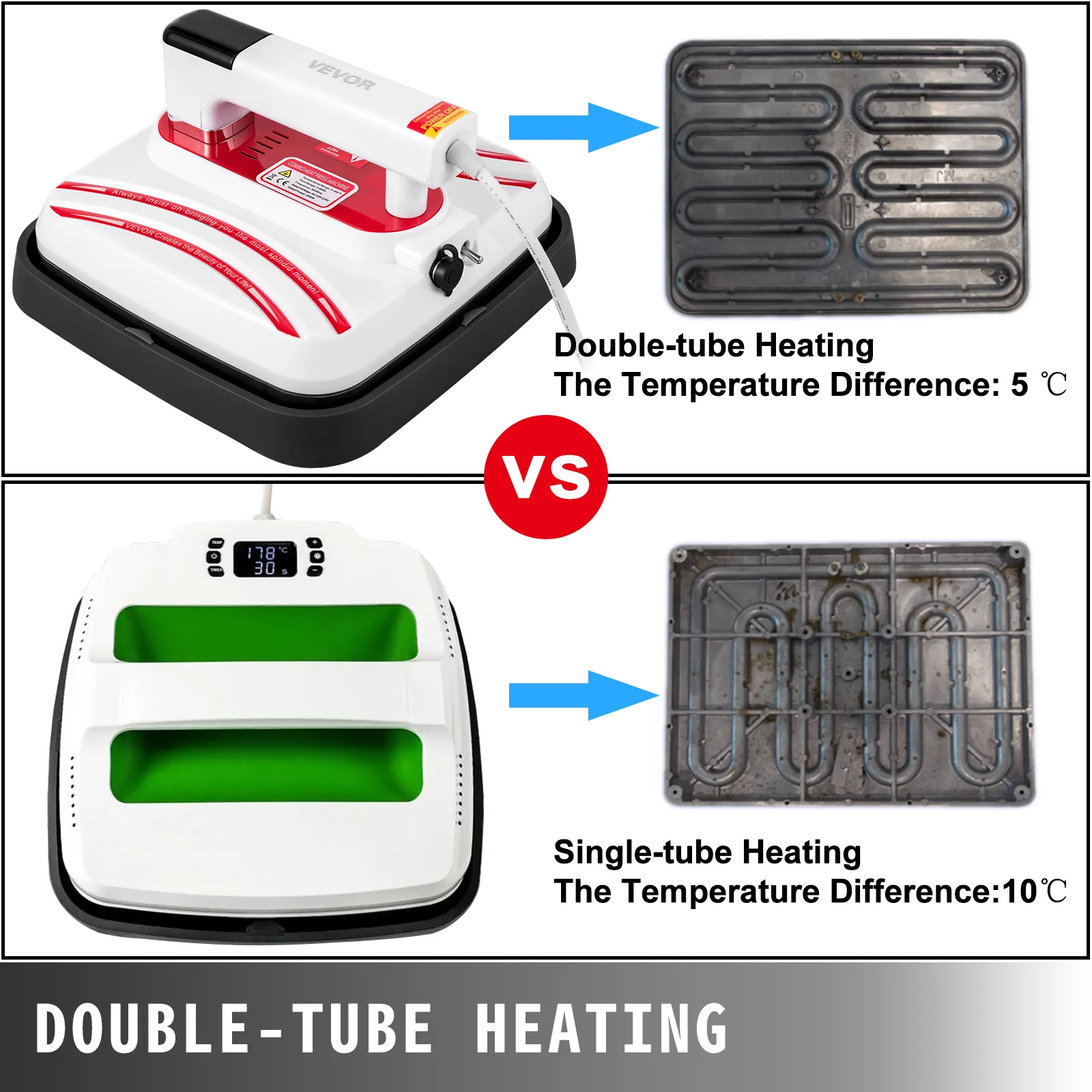 El calentamiento avanzado de doble tubo hace que la calefacción sea más uniforme que las máquinas de prensado de camisa de un solo tubo. Solo se puede sentir un poco de calor en la superficie, incluso después de trabajar 2 horas bajo la temperatura de 200℃.