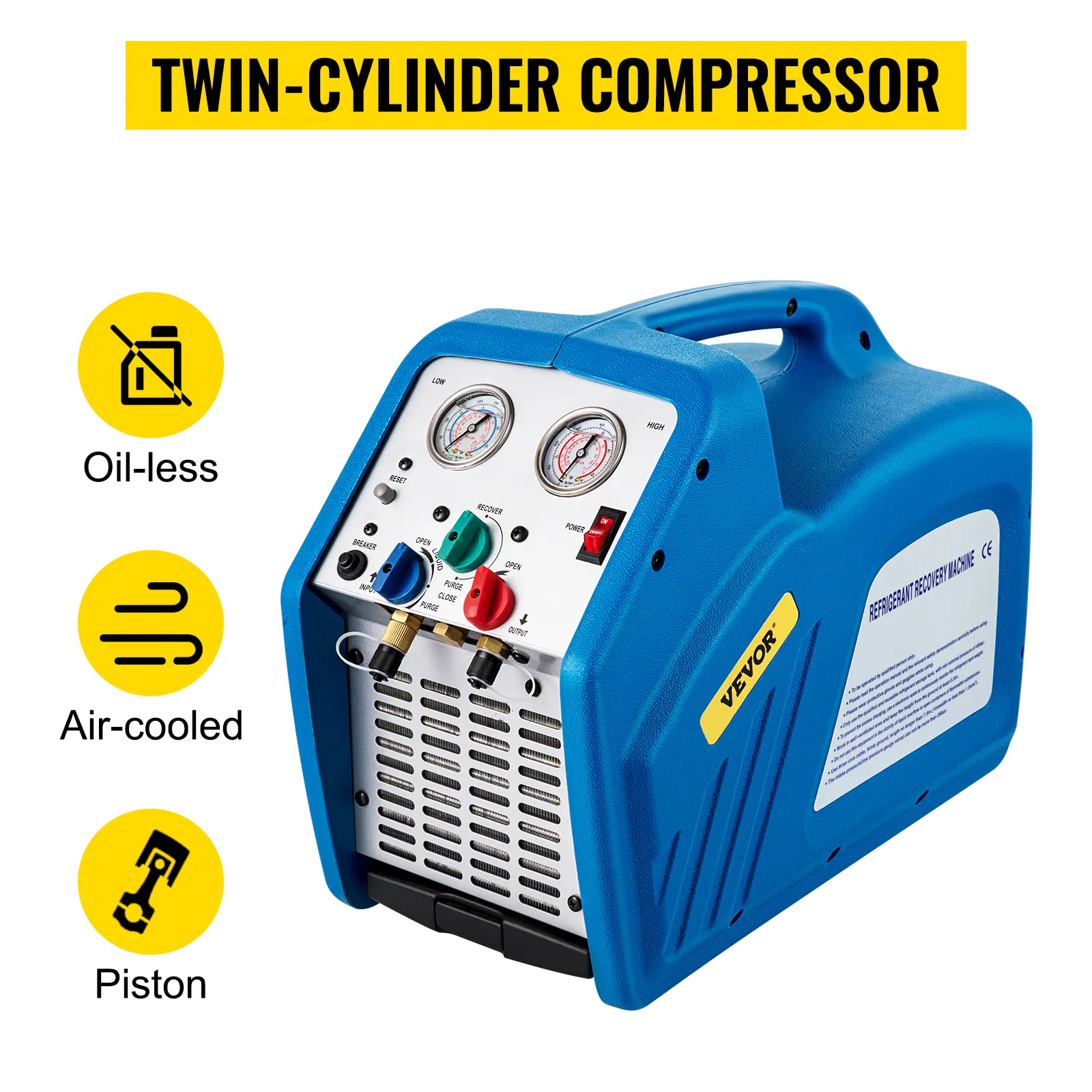El compresor sin aceite de dos cilindros de 110 V 60 HZ, 1 HP con 1750 rpm puede reciclar todo tipo de refrigerante, lo que lo ayuda a terminar el trabajo más rápido.