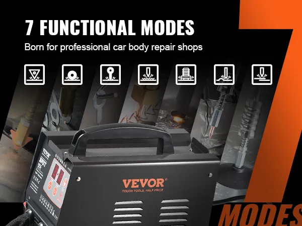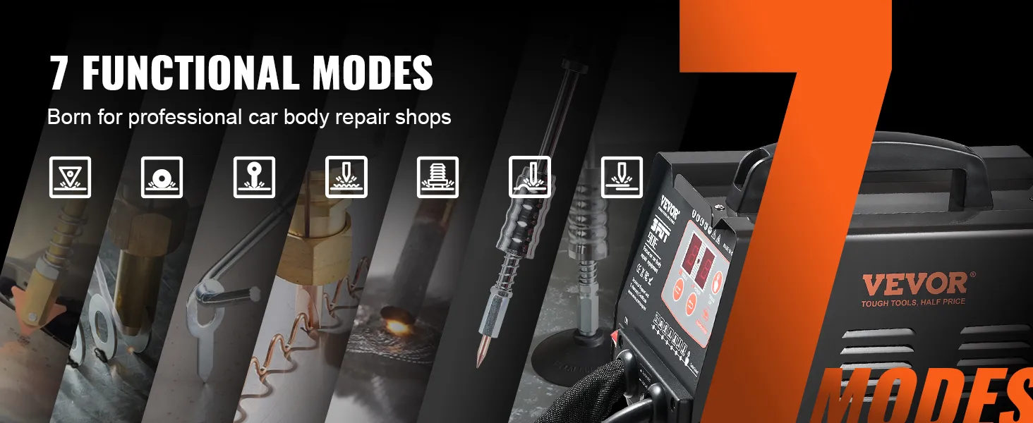 VEVOR auto body dent puller welder features 7 functional modes, including round, OT, triangle, wiggle wire, hot pressing, carbon rod, and single-sided spot welding. It caters to diverse repair needs and delivers efficient solutions for carbon steel, stainless steel, and iron.