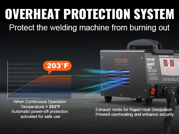 Our spot welding machine is equipped with an intelligent overheat protection system, which activates when the temperature exceeds 203℉, preventing short circuits and machine damage. Tthe side vents also ensure rapid heat dissipation, making welding hassle-free and secure.