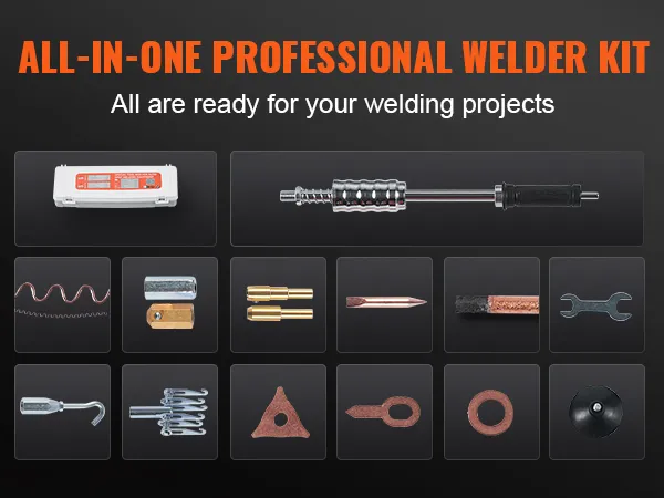 Comprehensive Accessories: VEVOR welding dent puller comes with a complete set of accessories stored in a toolbox, enabling you to tackle all common dent problem. Its compact design and convenient handle make it highly portable for effortless use anywhere you need it.