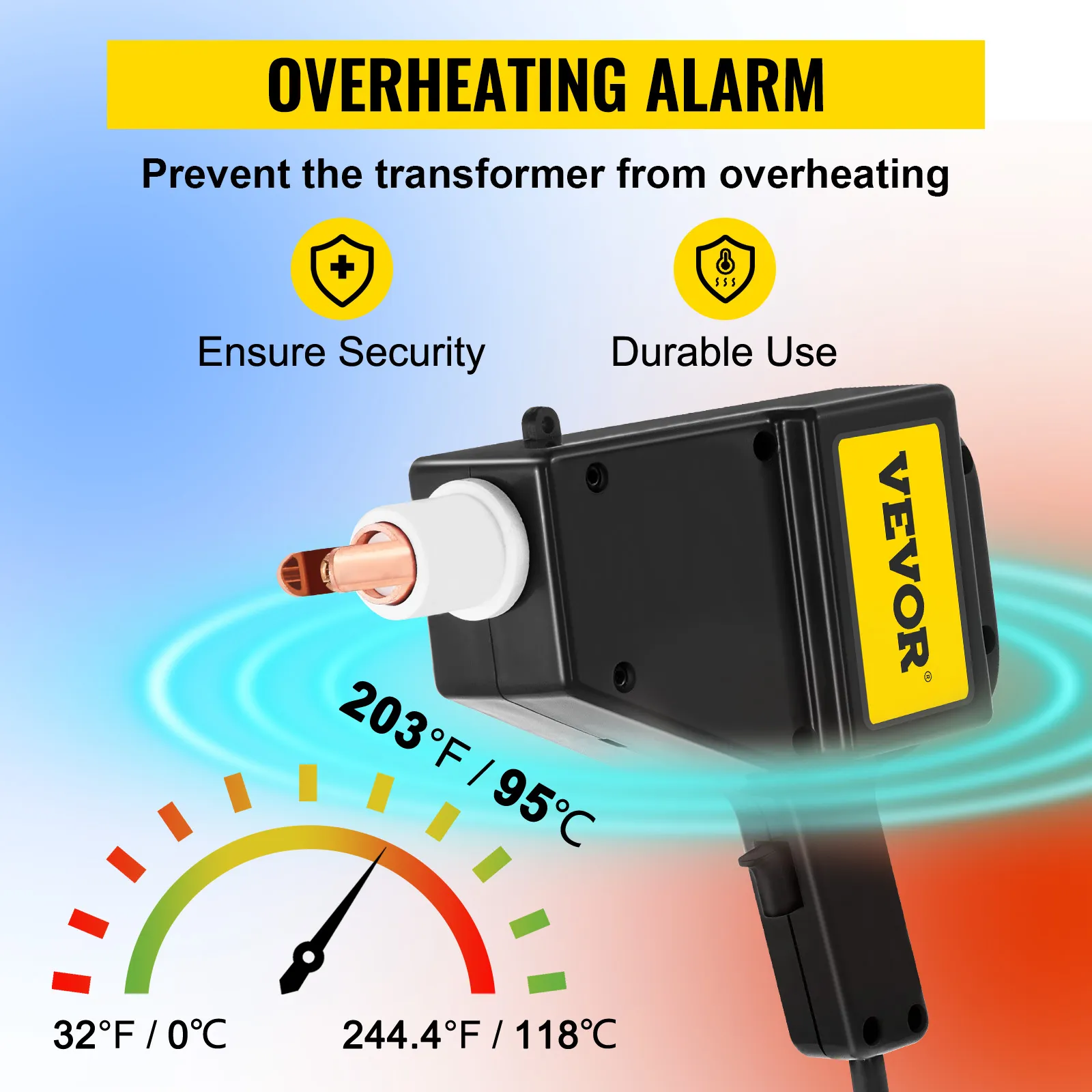 Nuestro extractor de abolladuras para soldador de espárragos tiene protección de sobrecarga incorporada. Cuando la temperatura del transformador principal alcance los 203 °F, la protección térmica de la soldadora funcionará para garantizar la seguridad del dispositivo.