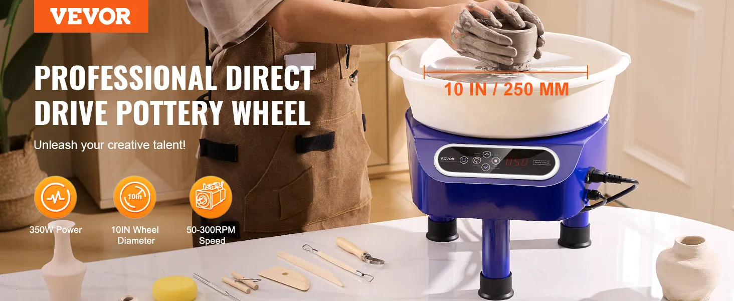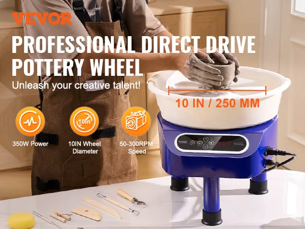 VEVOR - Torno de cerámica de 10 pulgadas, torno eléctrico de 350 W con pedal y pantalla táctil LCD, rueda de cerámica de accionamiento directo con 3 patas de apoyo para manualidades, color azul