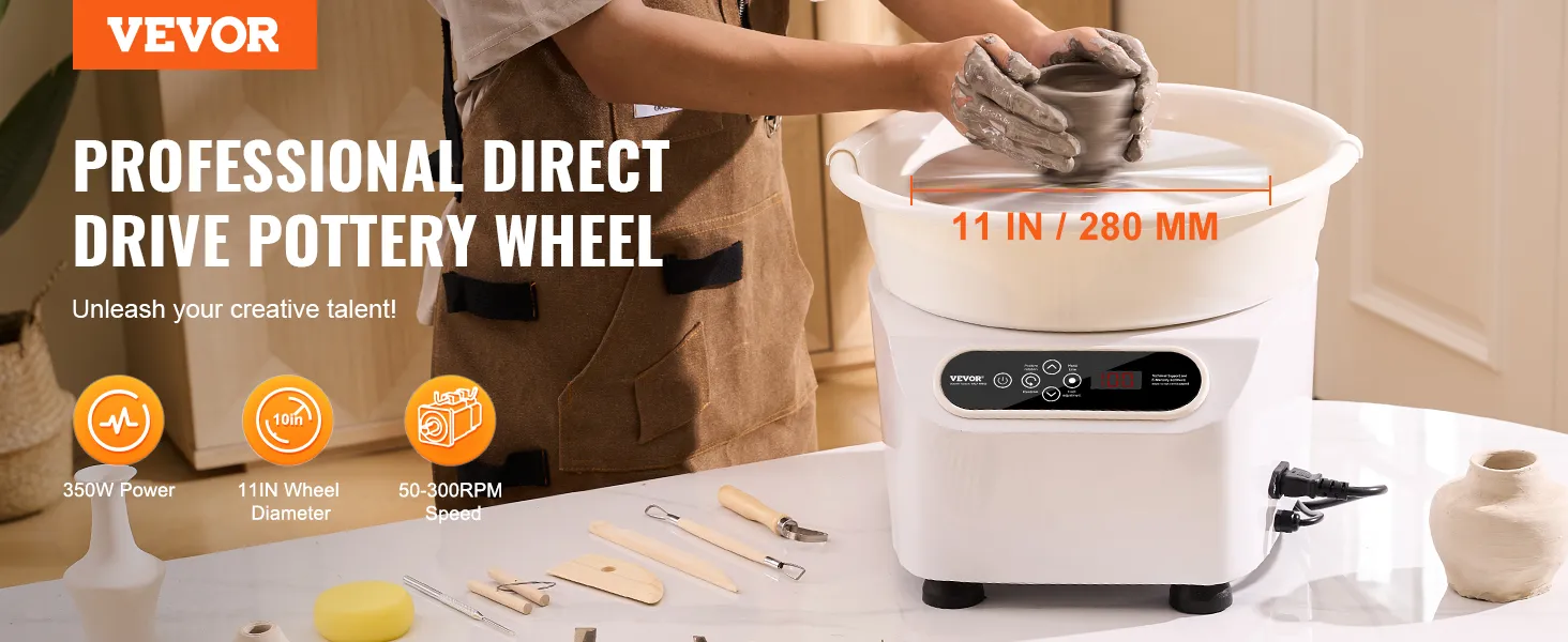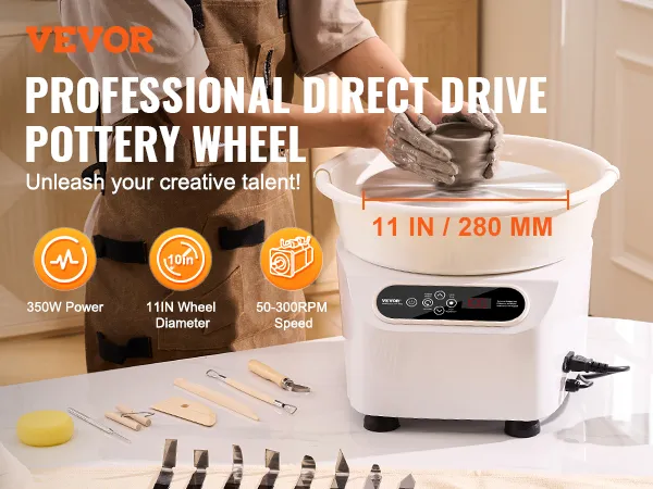 El motor de accionamiento directo de alta potencia de 350 W proporciona amplia potencia, lo que garantiza que el torno de alfarería funcione sin problemas en todas las condiciones de trabajo. La velocidad ajustable de 50-300 RPM permite un control preciso de la velocidad y creaciones más versátiles.