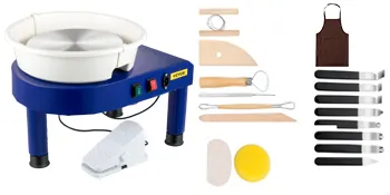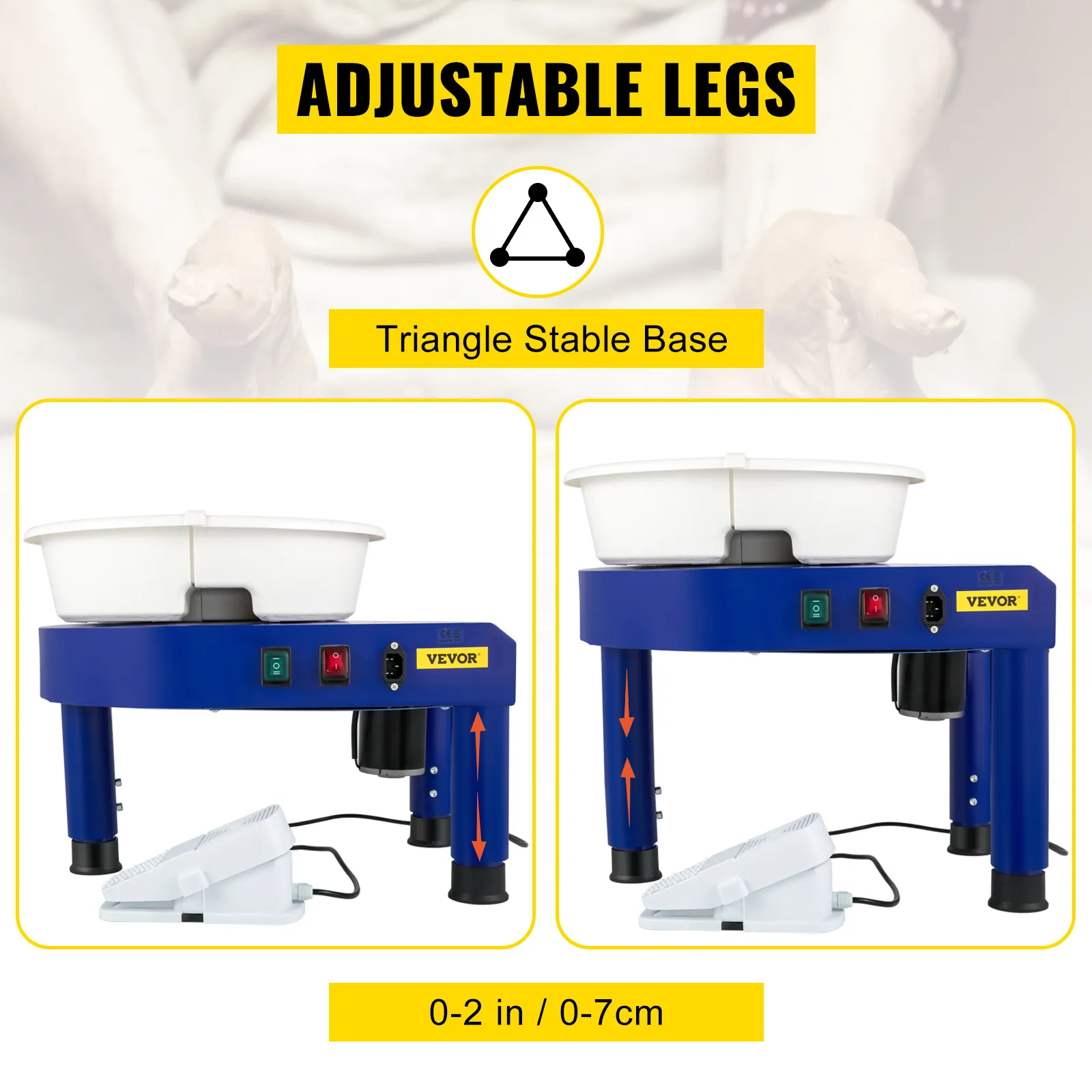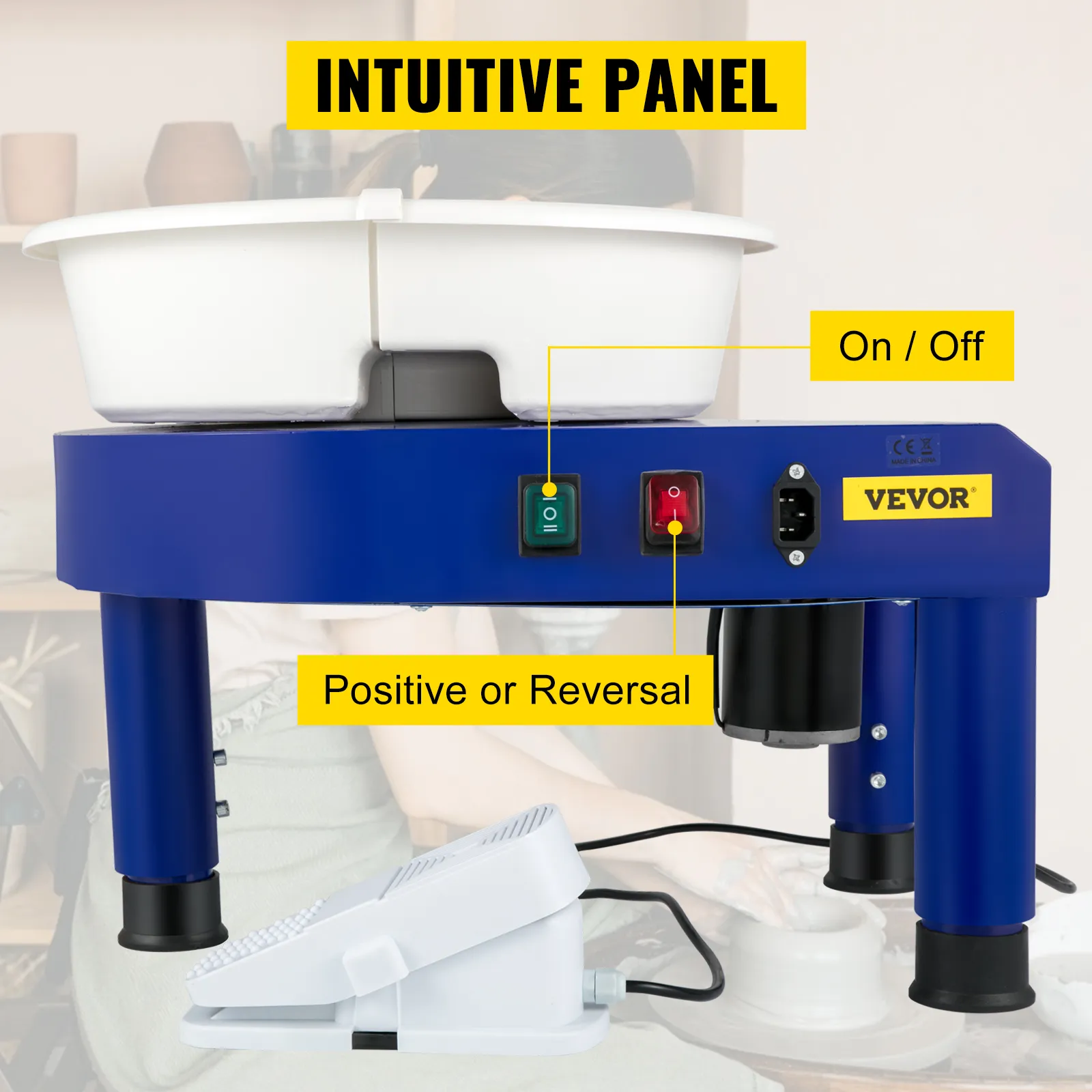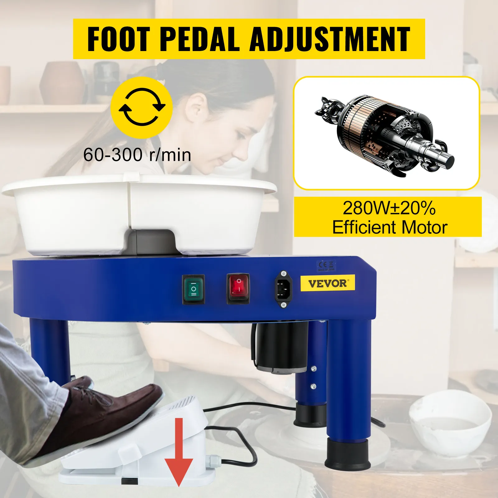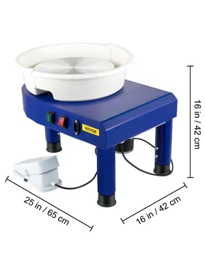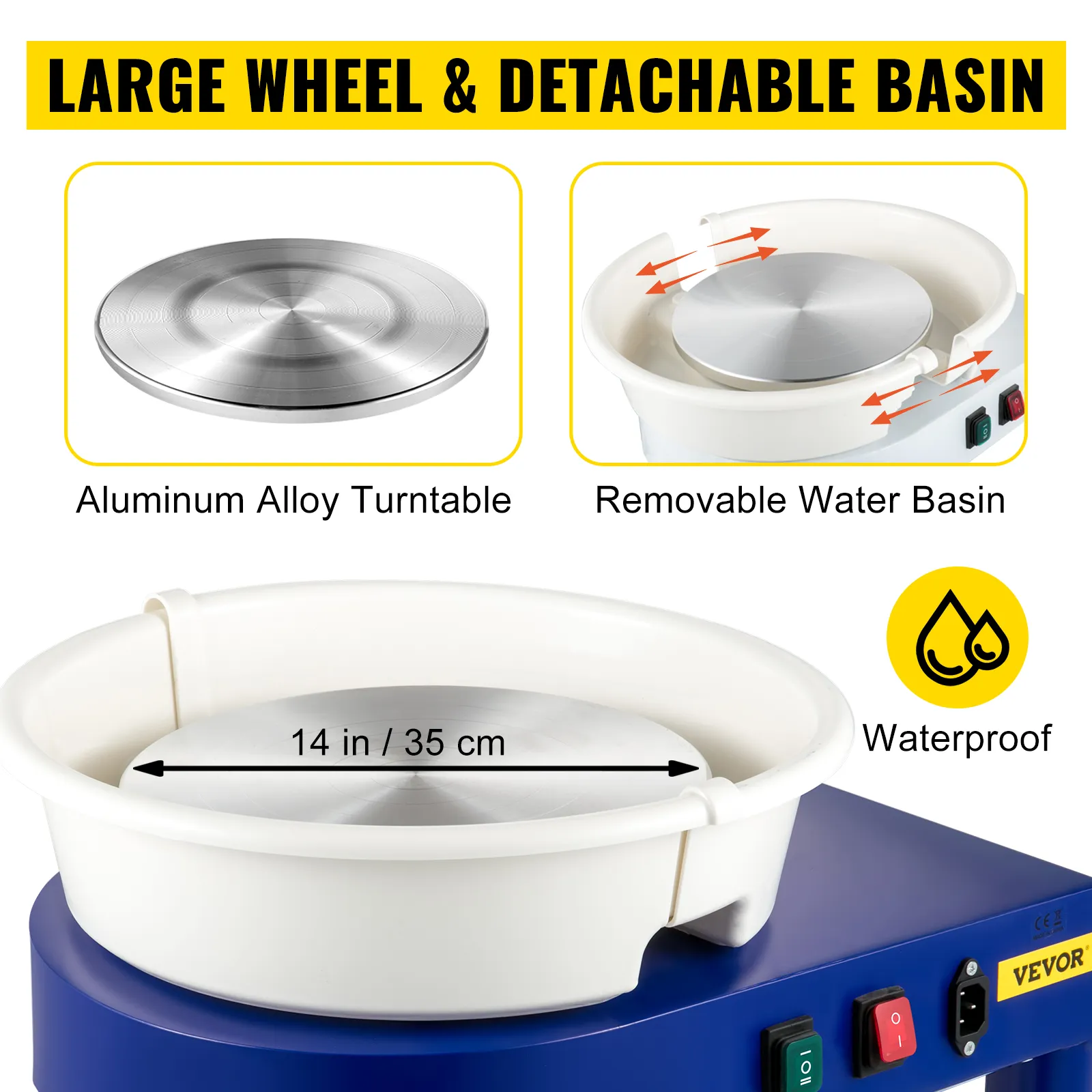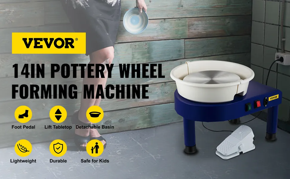 - La máquina de rueda de cerámica de VEVOR viene con un recipiente de agua extraíble y una plataforma giratoria de aleación de aluminio de alta calidad de 14 "que puede girar en dos direcciones. Una base resistente permite levantar o bajar la mesa con facilidad. Además, el potente motor de 450W ayuda a que esta rueda de cerámica funcione de manera constante con poco ruido, especialmente adecuada para la enseñanza escolar, talleres de bricolaje de cerámica, bricolaje doméstico, etc. Eleve sus habilidades de cerámica y cree una obra maestra con recuerdos de serenidad y una atmósfera clara.