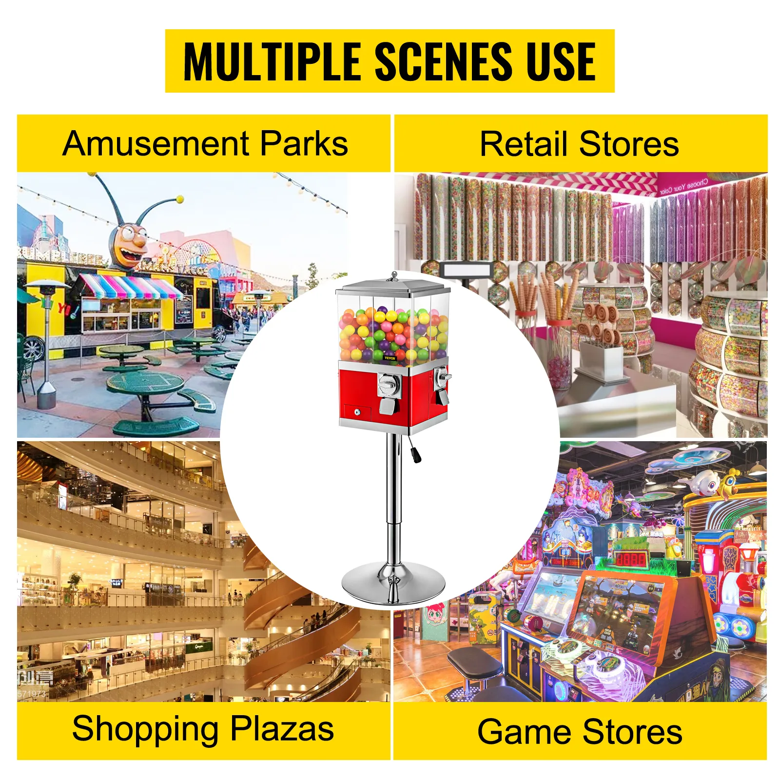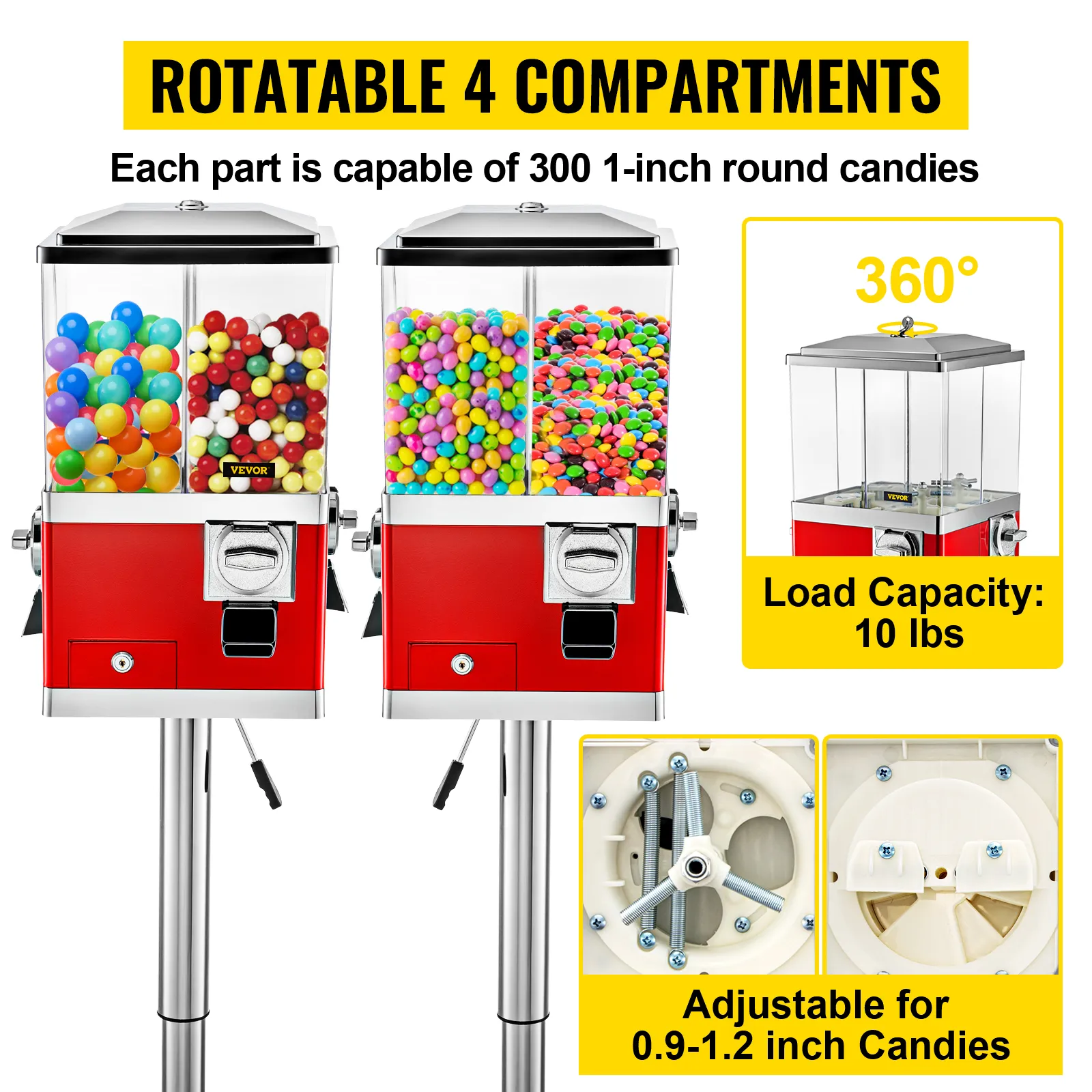 Los 4 compartimentos removibles le permiten vender dulces, chicles, nueces, juguetes, pelotas inflables y más. Máquina expendedora de caramelos con una capacidad de unos 300 chicles de 1" o caramelos de 10 libras por compartimento.