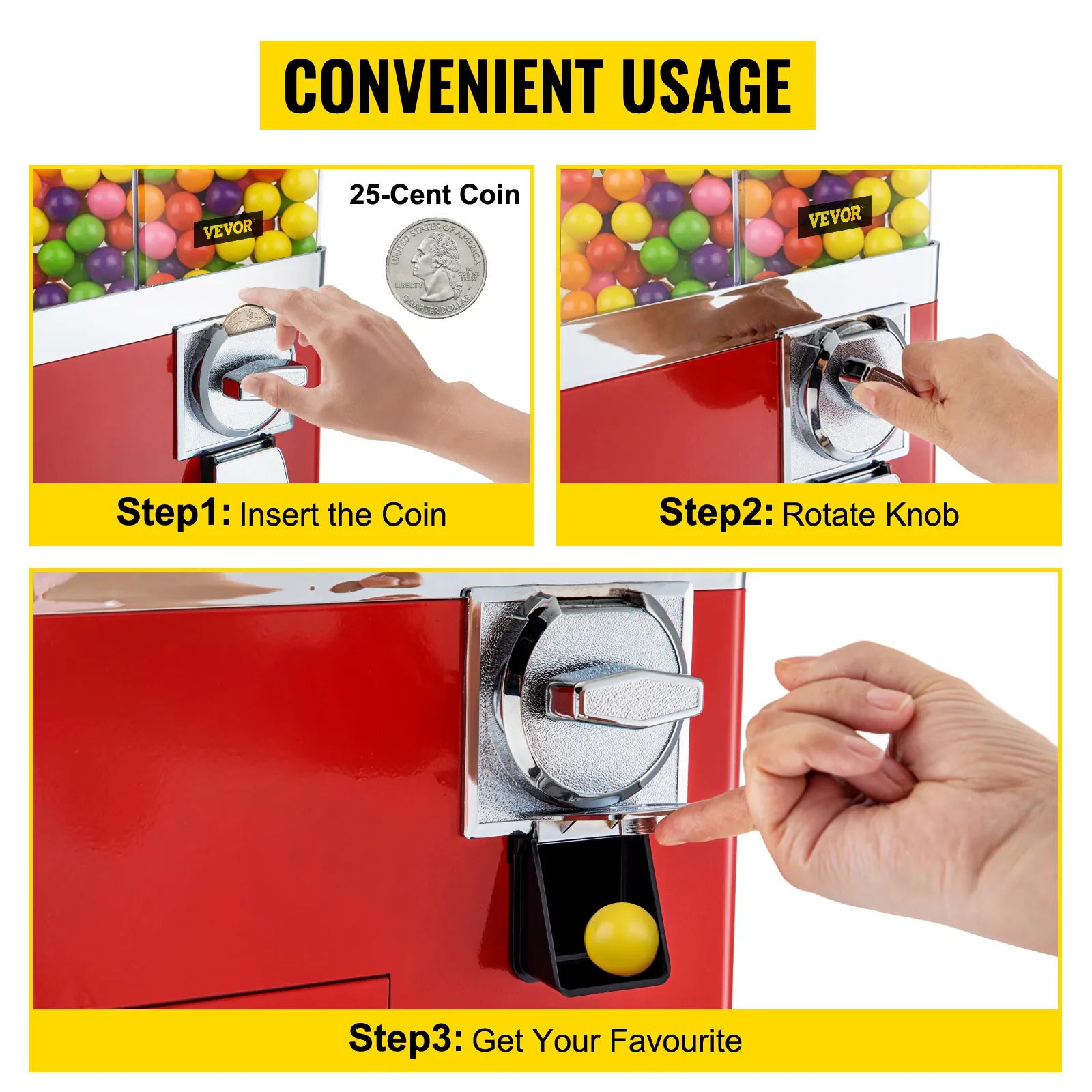 La perilla giratoria brinda a los clientes un fácil acceso a los productos simplemente girándola 360 grados. Se necesita una moneda para cada transacción. La conversión de esta máquina expendedora doméstica se puede cambiar al modo sin cargo.