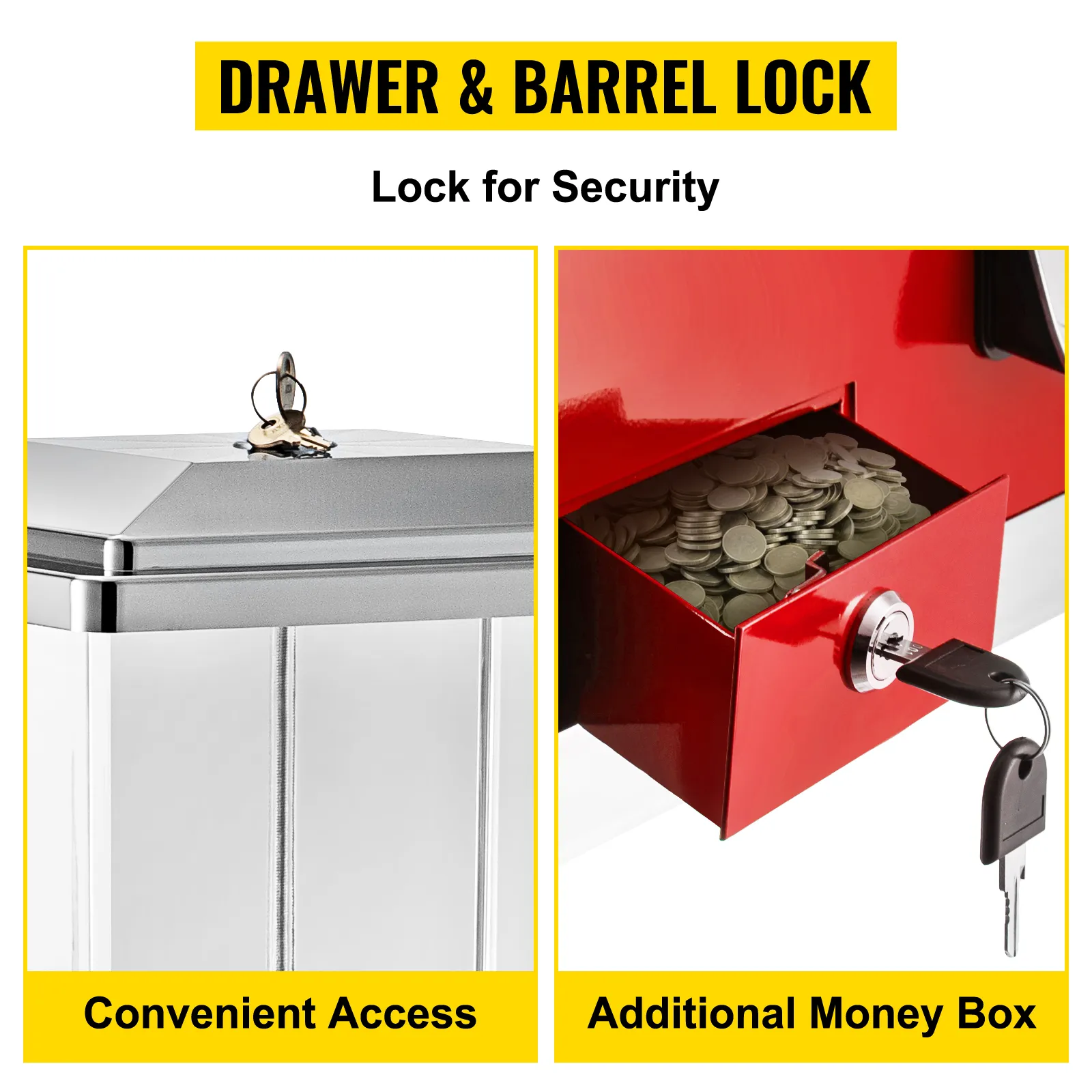 Nuestras máquinas expendedoras para empresas cuentan con 2 cajones para guardar la moneda, y las llaves adicionales para cerrar el cajón pueden garantizar la seguridad de la propiedad. Mientras tanto, cada tarro tiene un candado en la parte superior, lo que garantiza que los dulces no se los lleven a voluntad.
