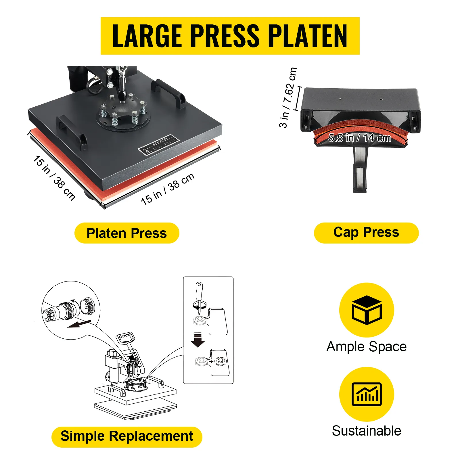 - Prensa de platina: 15 x 15 pulgadas / 38 x 38 cm