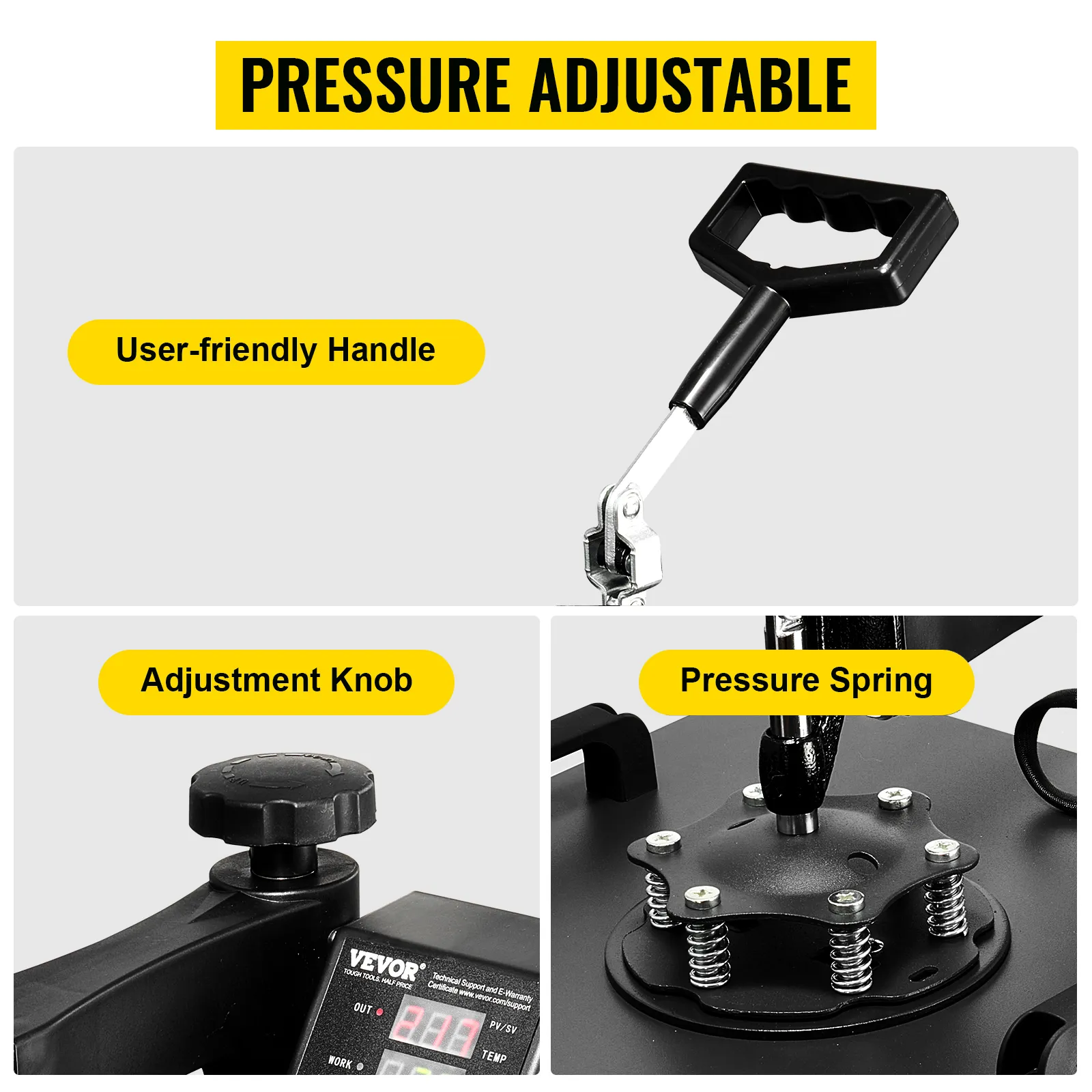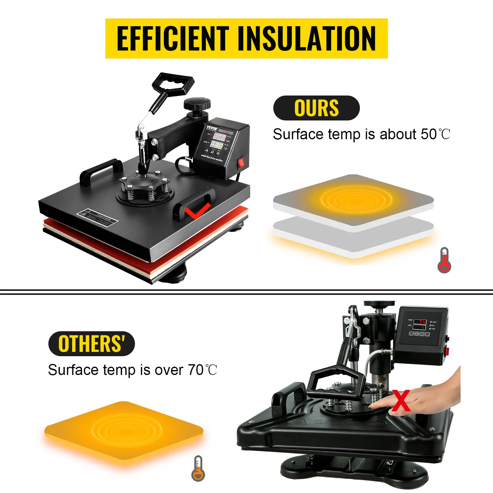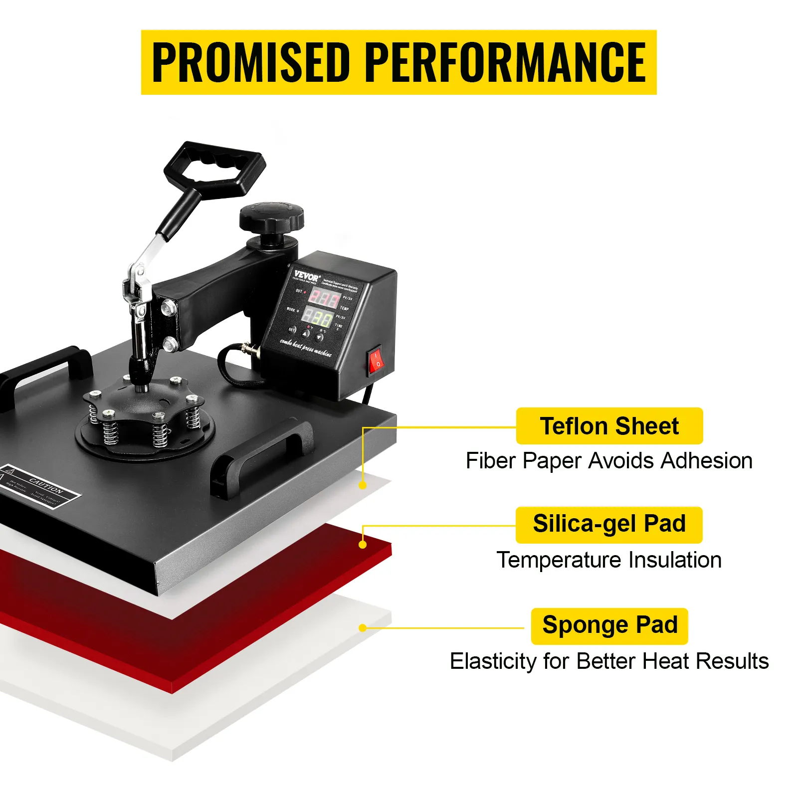 Esta prensa térmica cubierta de teflón reduce el riesgo de quemaduras durante los traslados. Es fácil de limpiar y puede hacer que la impresión sea más estable. También está equipado con un cable a tierra para un funcionamiento seguro.