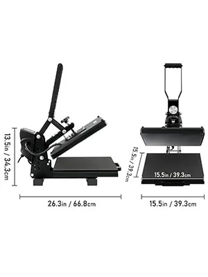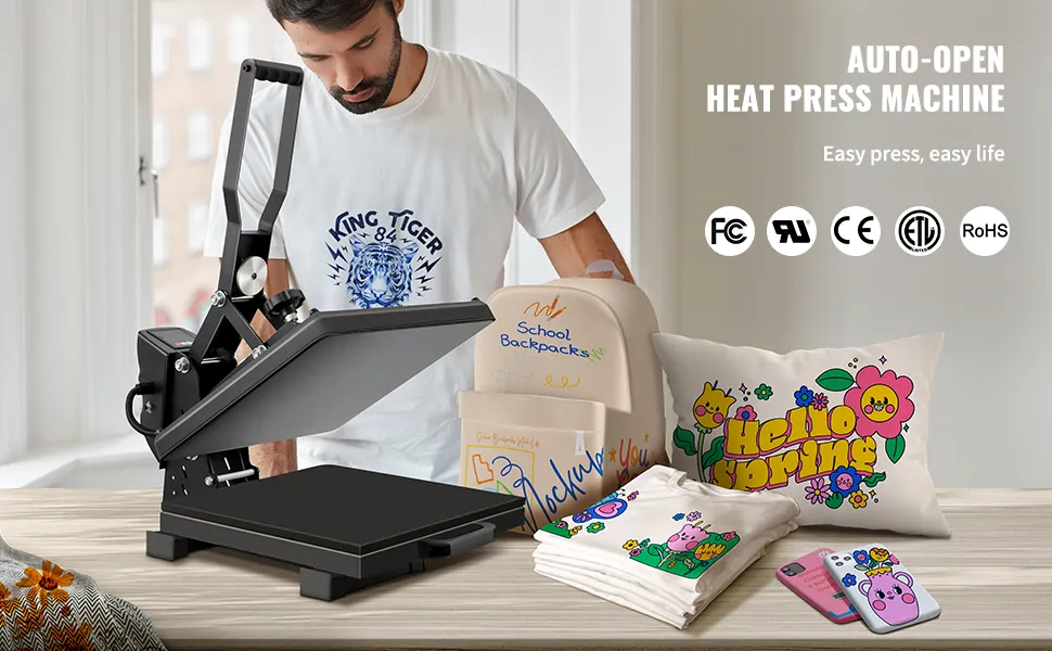 - Prepárate para ver todas tus obras transferirse maravillosamente. Esta máquina de prensa de calor de apertura automática magnética recién lanzada cuenta con todas las cualidades imprescindibles. La base estable en forma de U, la velocidad de calentamiento rápido, el chip de control inteligente, la superficie resistente a las quemaduras y la almohadilla de aislamiento térmico... todo esto garantiza una temperatura constante y un rendimiento de transferencia excelentes. ¡Todas las ideas creativas que se te ocurran se pueden implementar en esta máquina VEVOR y llevar tus pasatiempos y negocios a un nuevo nivel!