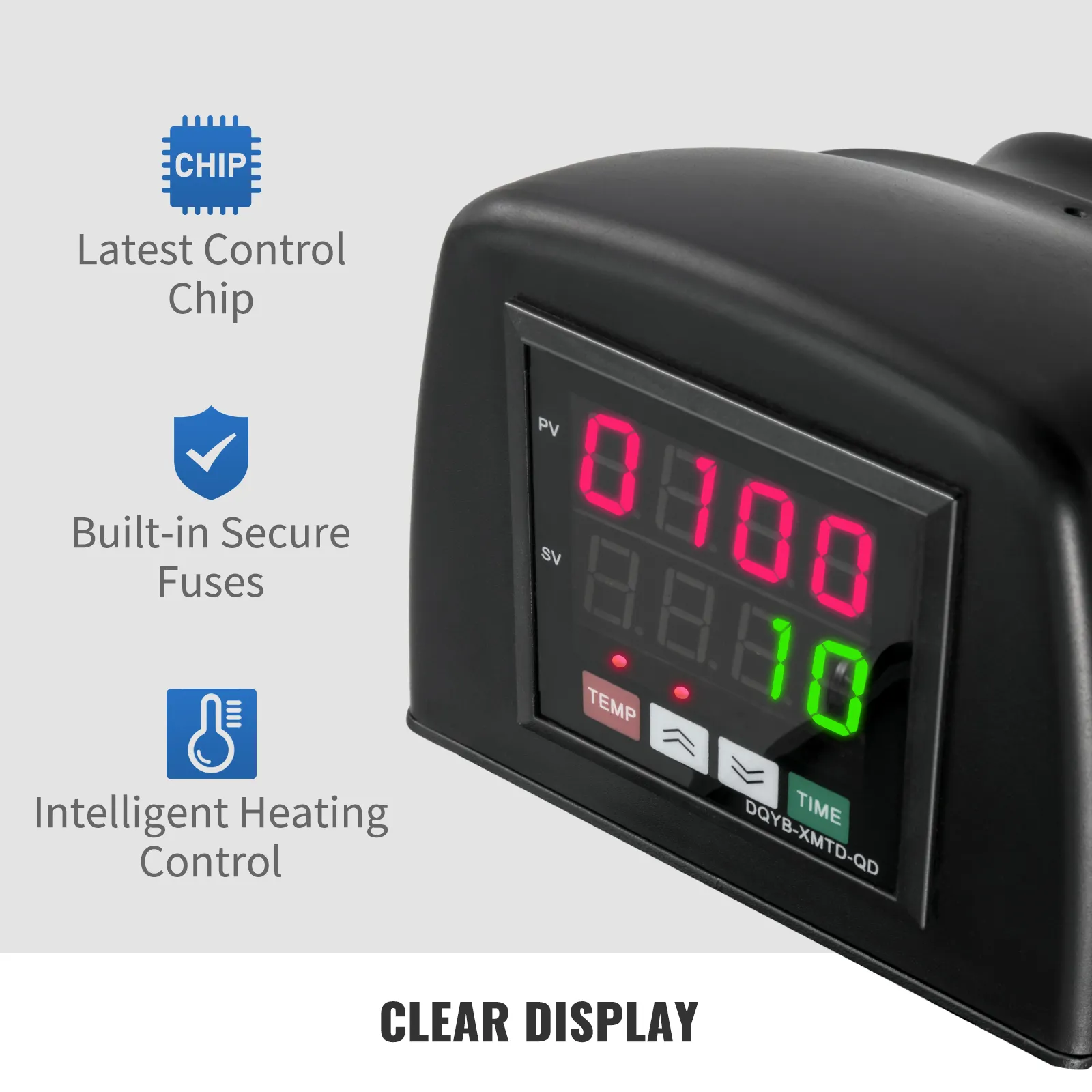 La pantalla independiente le ofrece un control completo y una visualización clara de la temperatura, el tiempo de trabajo y el conteo de lotes acumulativo durante la operación. El fusible incorporado evita de manera efectiva que la máquina se sobrecaliente mientras logra la temperatura deseada.