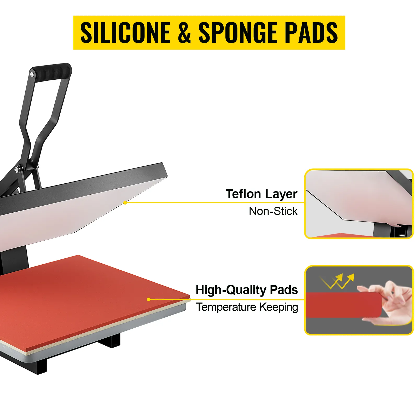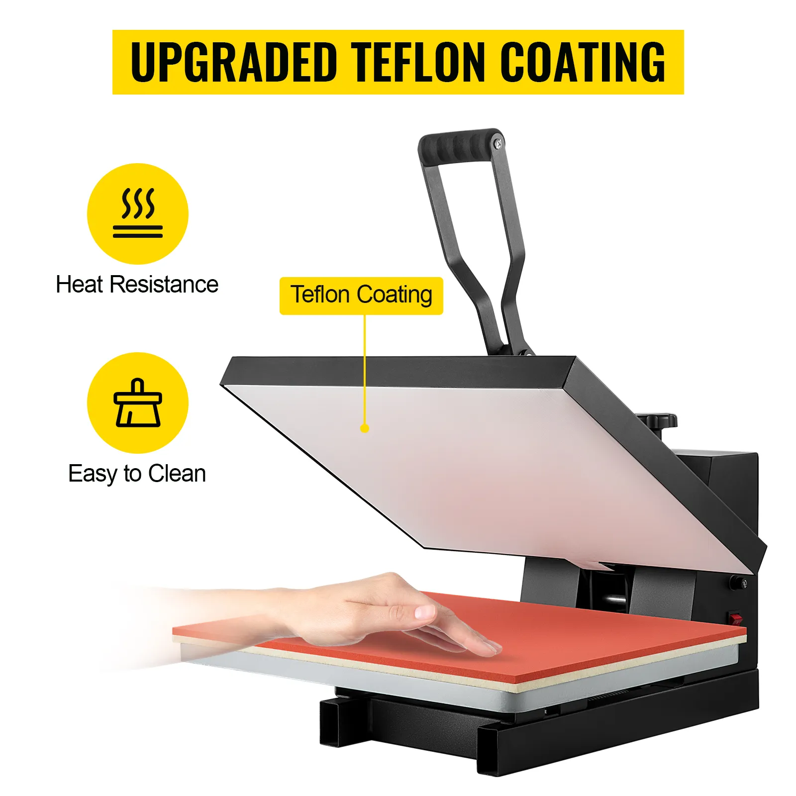 Para proteger el material de las quemaduras, la placa de calentamiento de la máquina de prensado térmico VEVOR está recubierta de teflón. Este material es muy resistente al calor y tiene propiedades antiadherentes. Como resultado, la placa de calentamiento de la máquina no se calienta excesivamente. La naturaleza antiadherente del teflón evita que la ropa y otros elementos se peguen a la placa. Entonces, ¿está listo para hacer una declaración? Nuestra máquina de prensado térmico le permite crear diseños personalizados que dejan una impresión duradera.
