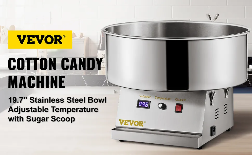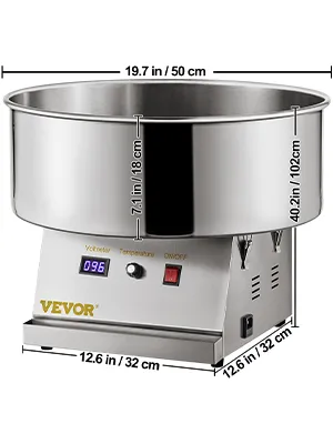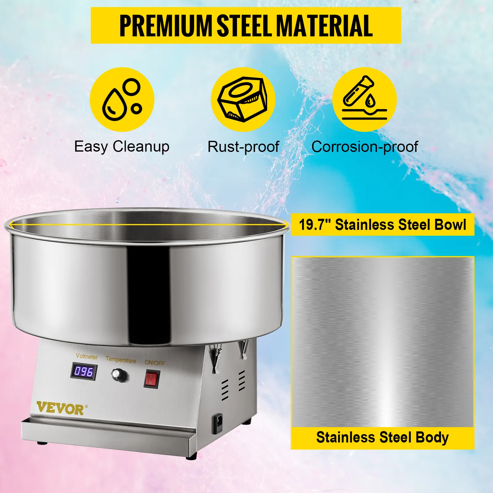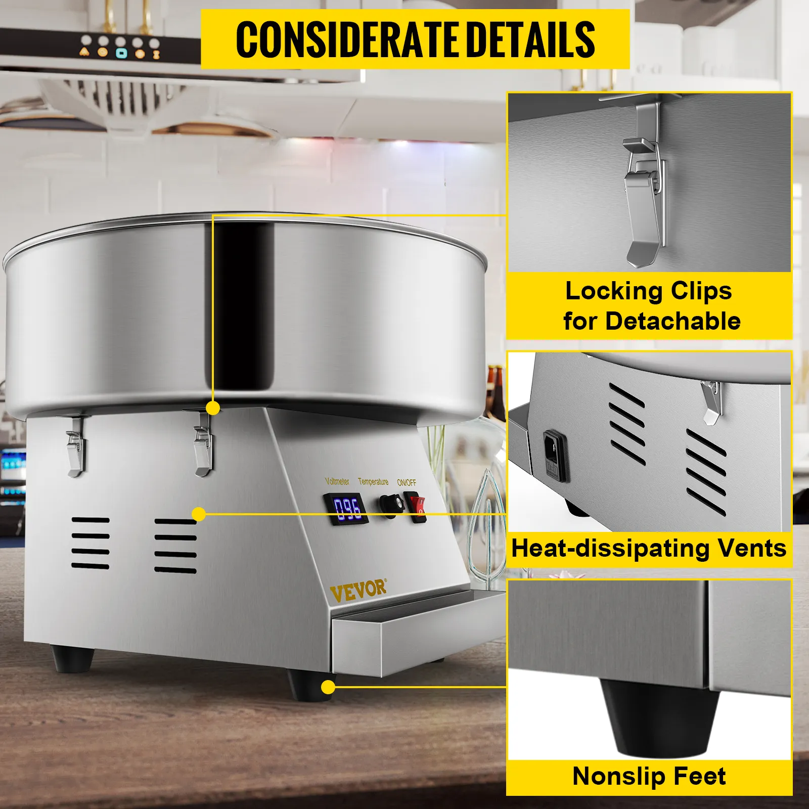 La máquina eléctrica para hacer algodón de azúcar está ensamblada con un recipiente y un cuerpo de acero inoxidable apto para uso alimentario de 19,7 pulgadas de diámetro , con una apariencia brillante, que es a prueba de herrumbre, resistente a la corrosión y fácil de limpiar. Esta máquina de alta calidad es duradera y resistente para usar.