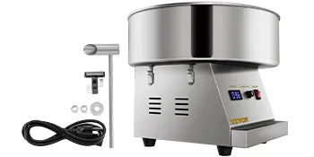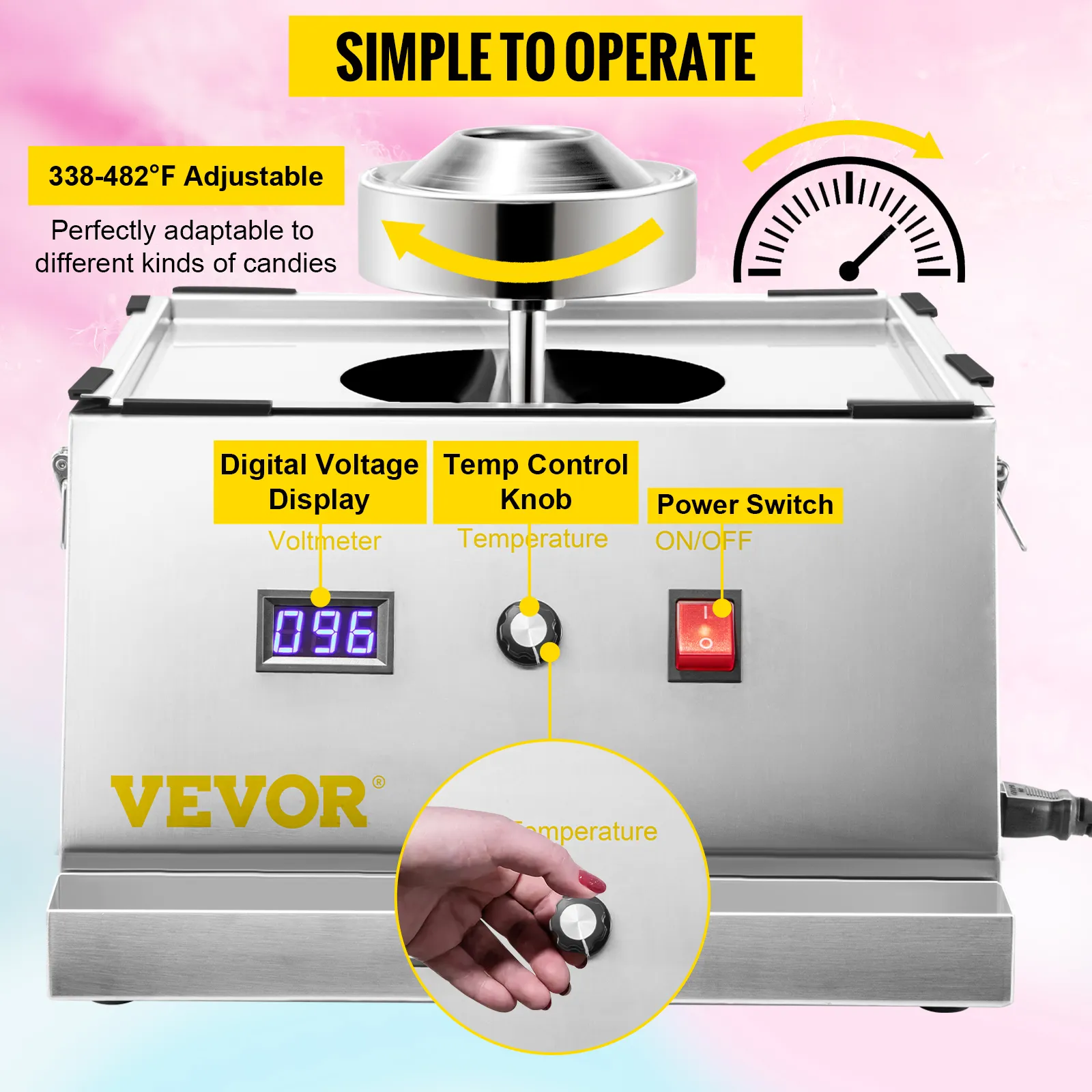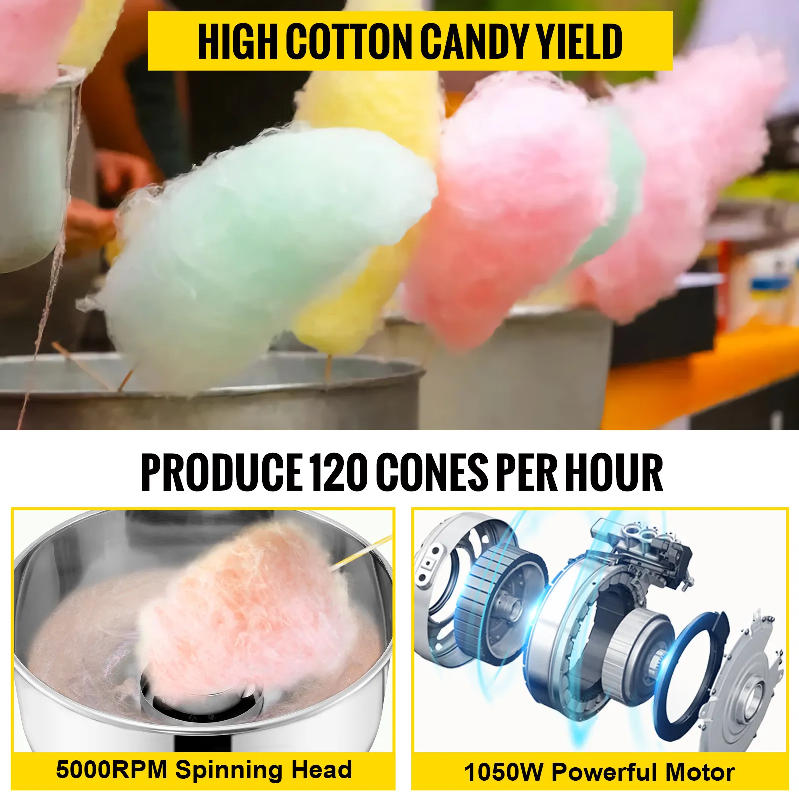 Esta máquina para hacer algodón de azúcar tiene un motor de 1050 W con un cabezal giratorio de 5000 RPM, que produce alrededor de 2 algodón de azúcar por minuto. Puede ajustar la temperatura de 338 ℉ a 482 ℉ con la perilla de control de temperatura. El recipiente de acero inoxidable de 19,7 pulgadas de diámetro se puede quitar con clips de bloqueo. Además, es simple de operar en unos pocos pasos y tiene detalles bien diseñados. Este fabricante de algodón de azúcar es perfecto para varias fiestas y es adecuado para la mayoría de los tipos de azúcar.