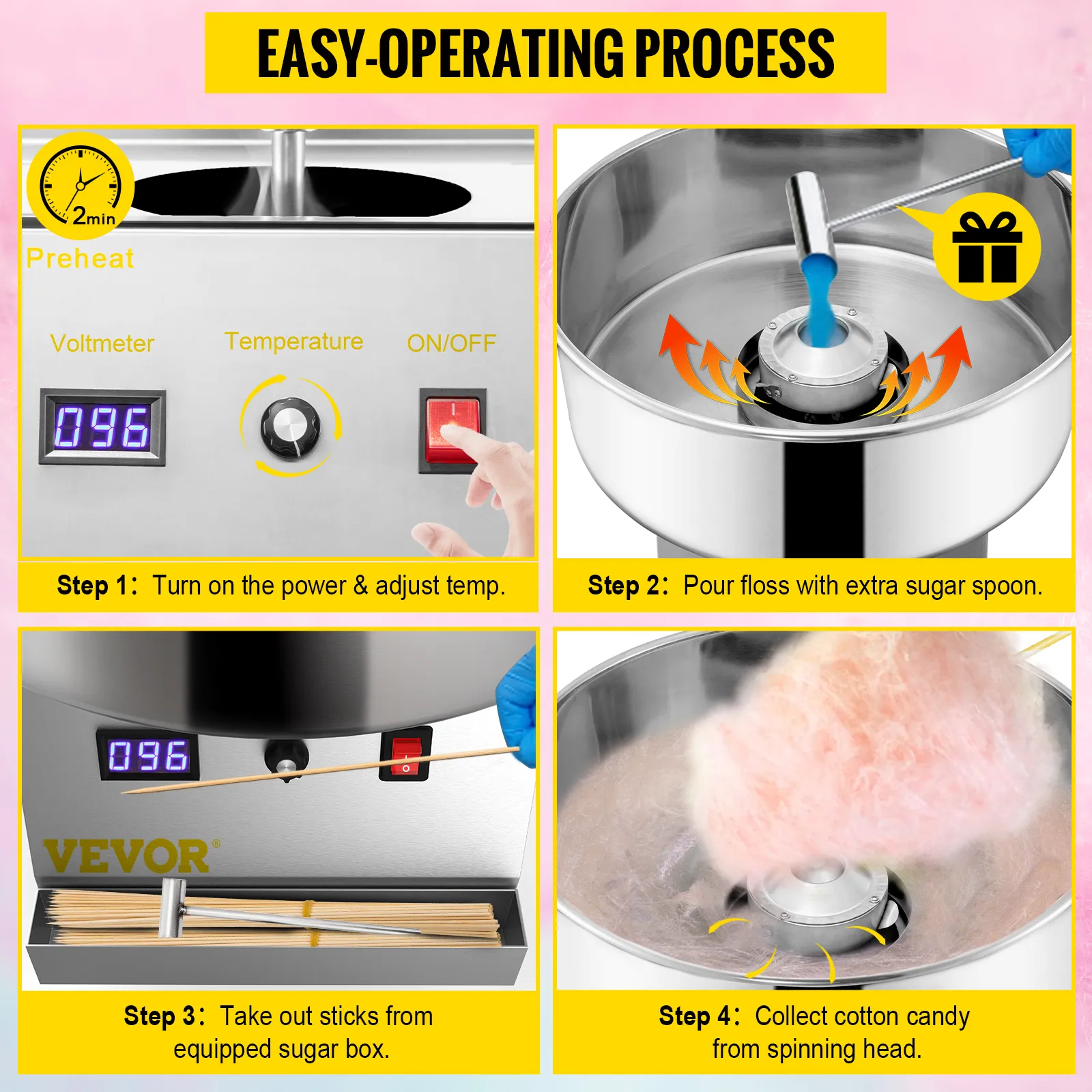 Usar esta máquina no podría ser más fácil. Encienda la alimentación, ajuste la temperatura, caliente durante 2 minutos y vierta azúcar en la cabeza giratoria con la cuchara de azúcar adicional, y luego solo necesita usar los palos para recoger los dulces de algodón de la cabeza.