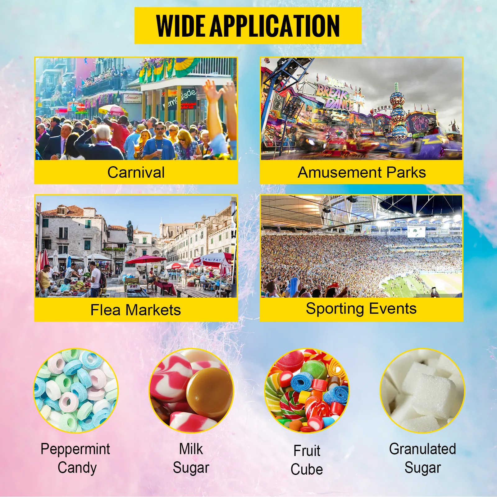 Puedes hacer tú mismo tus algodón de azúcar con todo tipo de azúcares o dulces que te gusten, como azúcar de hilo de colores, azúcar de leche, cubos de frutas, caramelos duros, etc. Es perfecto para festivales, carnavales, fiestas, eventos deportivos, incluso familiares y sociales. reuniones