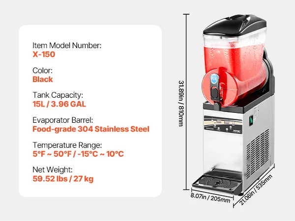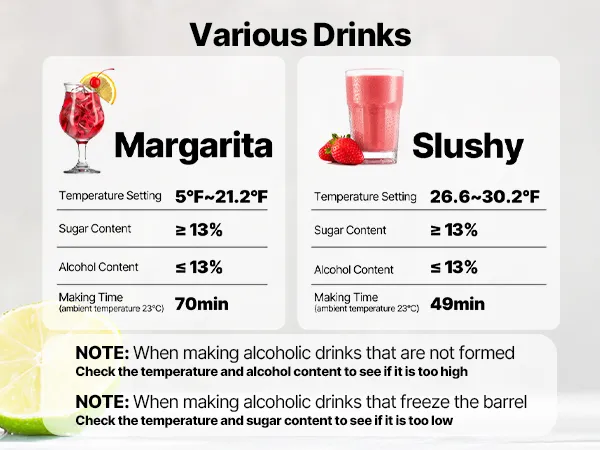 Para diversas bebidas: Esta máquina comercial mejorada para granizados cuenta con un rango de temperatura ajustable de 5 ~ 50 ℉ / -15 ~ 10 ℃, lo que le permite controlar la suavidad o dureza de sus bebidas. Para bebidas frías: 3 ~ 5 ℃ / 37,4 ~ 41 ℉; para granizados sin alcohol: -3 ~ -1 ℃ / 26,6 ~ 30,2 ℉; para bebidas alcohólicas: -15 ~ -6 ℃ / 5 ~ 21,2 ℉. (Contenido de azúcar recomendado: alrededor del 13 %, contenido de alcohol: menos del 13 %). Es ideal para preparar diversas bebidas como jugos, té, margaritas y café helado.