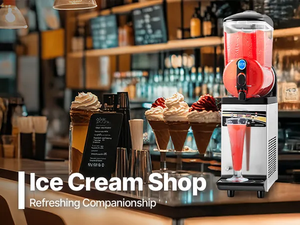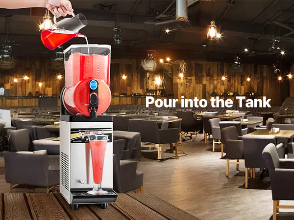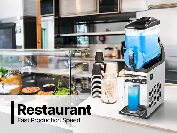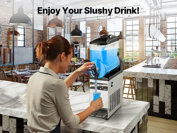 Tanque individual de 15 L: Con un tanque de 15 L (3,96 galones), esta máquina de granizados puede preparar aproximadamente 60 vasos de granizados por tanda. Requiere menos recargas, lo que la hace perfecta para uso comercial con mucho tráfico. El tanque transparente exhibe elegantemente las bebidas coloridas, ideal para heladerías, hamburgueserías, cafeterías, bares y otros entornos comerciales.