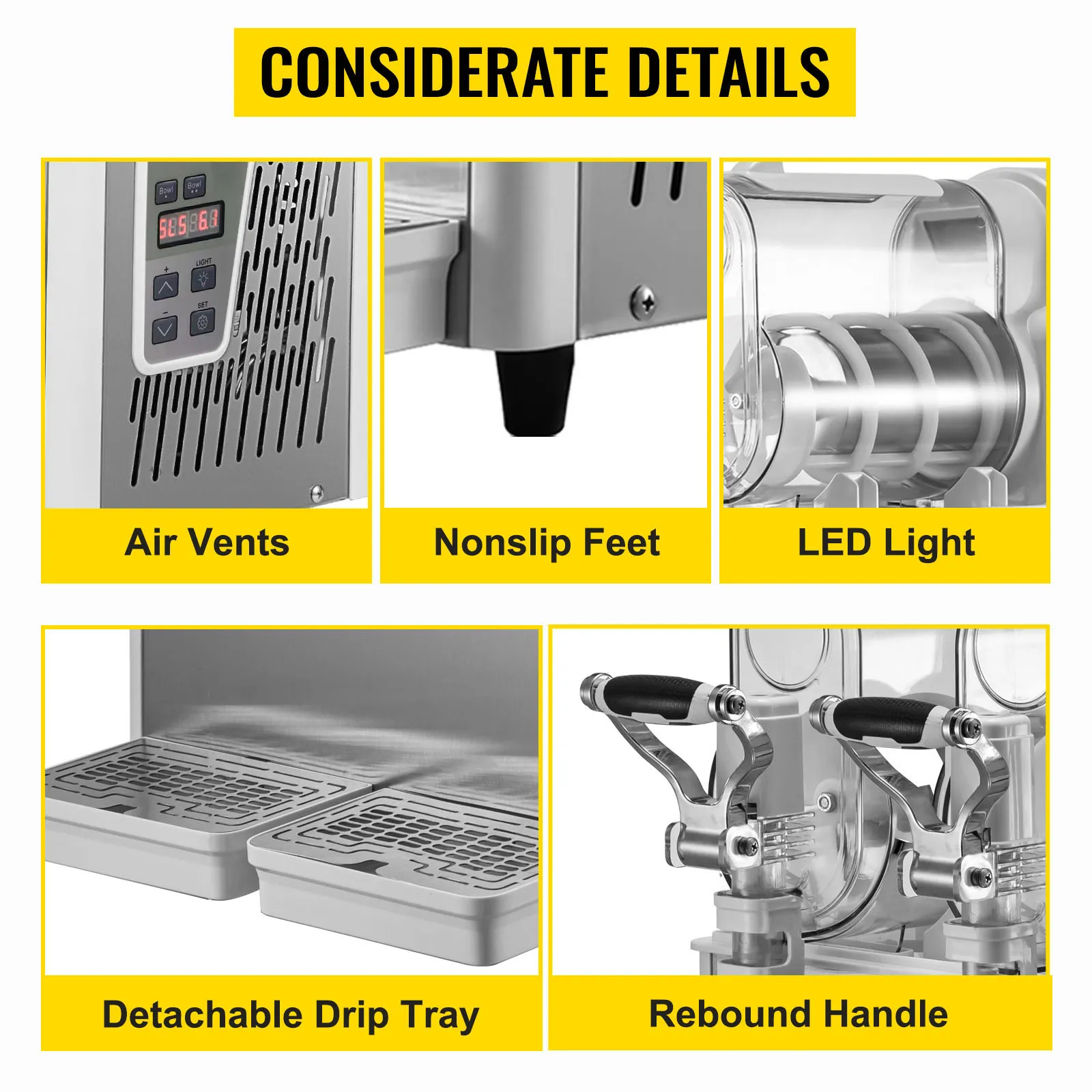 La luz LED en el recipiente hace que la bebida luzca más sabrosa. Agitadores de calidad alimentaria Admite mezcla de 360 ° y no es fácil de bloquear . Las rejillas de ventilación proporcionan una gran disipación del calor. Las manijas de rebote están diseñados para un uso conveniente. Las bandejas de goteo son desmontables para facilitar la limpieza. Los pies antideslizantes aseguran la estabilidad de esta máquina durante el funcionamiento.