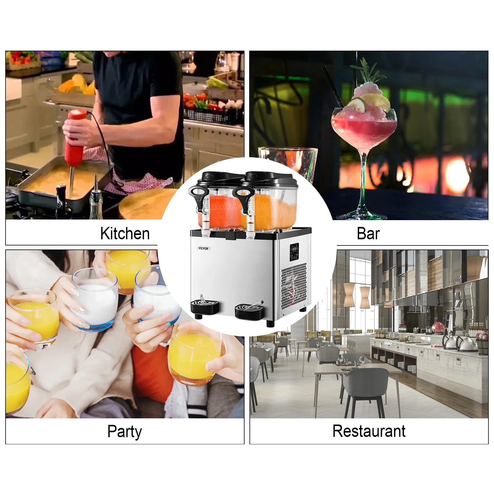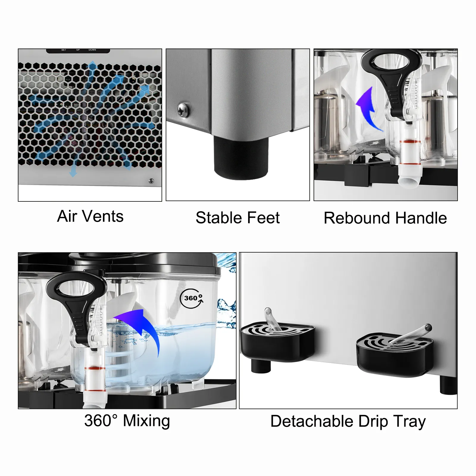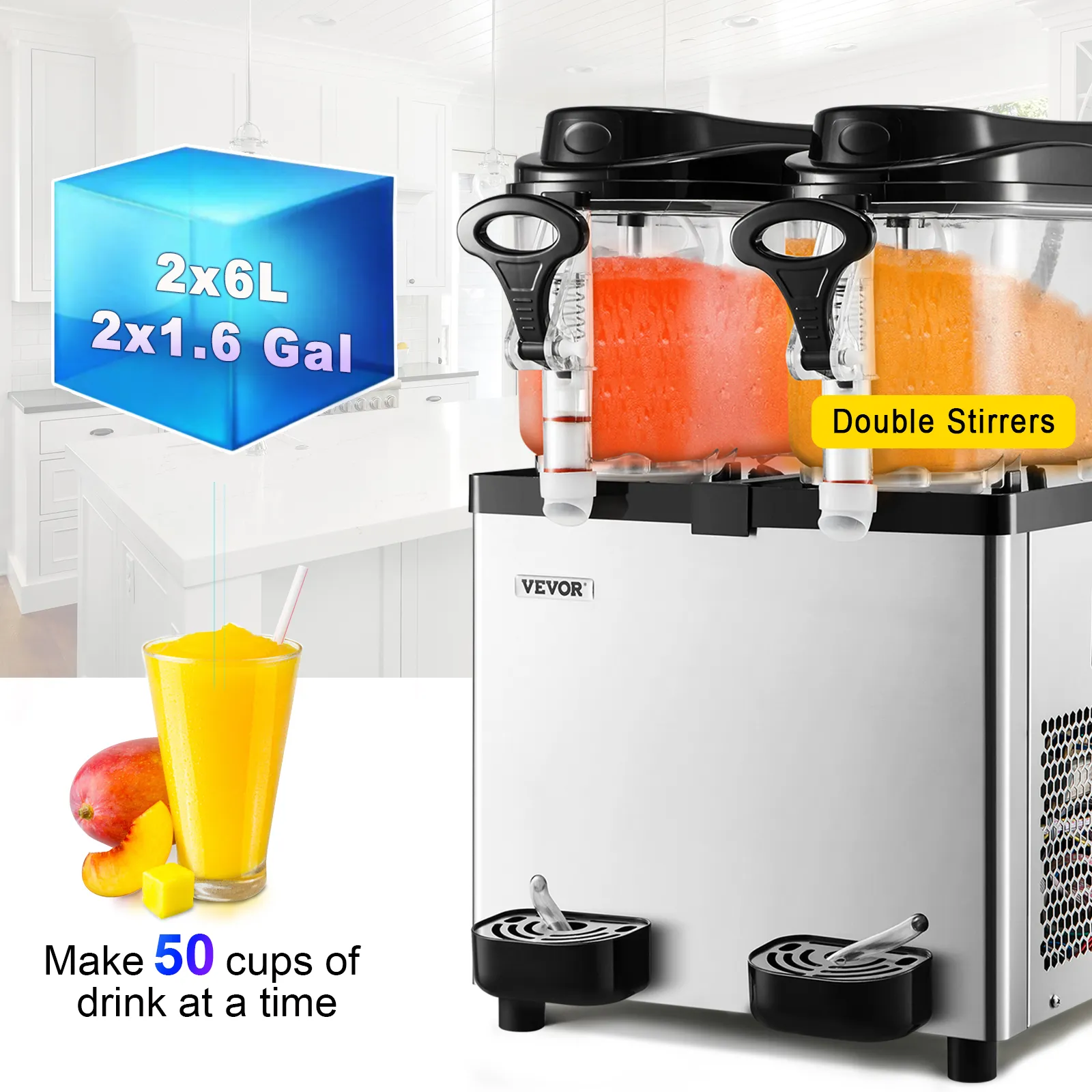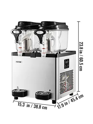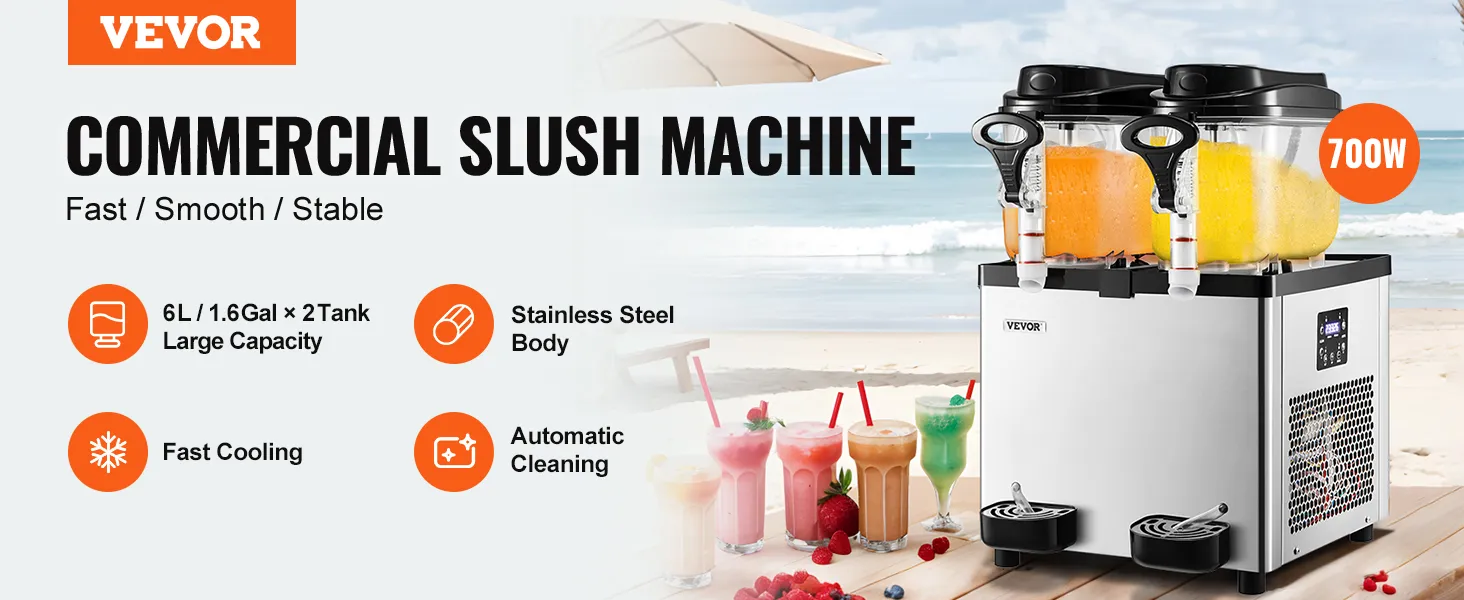 La máquina comercial de granizados cuenta con dos agitadores ensanchados para una mezcla completa y dos tanques grandes con una capacidad de 12 l/3,2 gal. Hace hasta 50 tazas de bebidas congeladas para que la fiesta continúe.